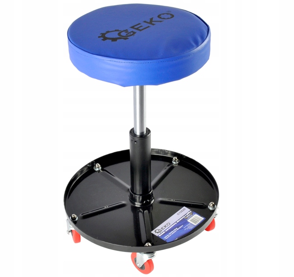 Робочий стілець із сталевою конструкцією, п’ятьма поворотними колесами (360°), повністю м’яким сидінням і роздільною полицею для інструментів.