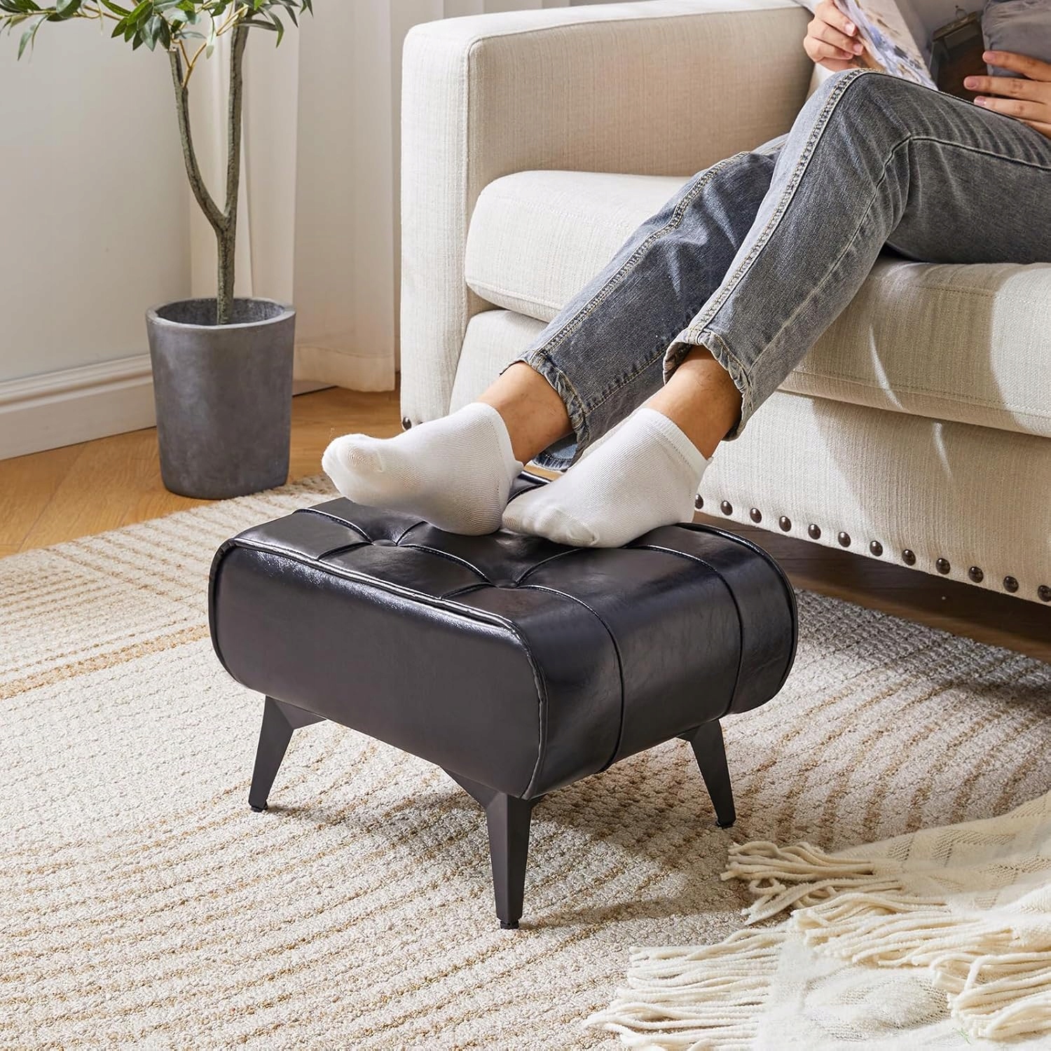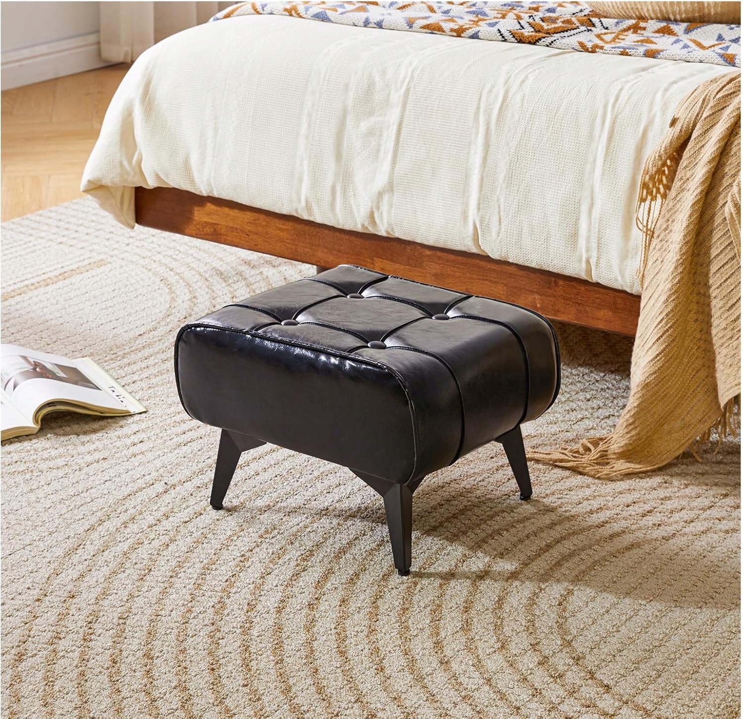 Табурет для ніг, оббитий поліуретановою шкірою, чорний, сталеві ніжки, табурет SLOT