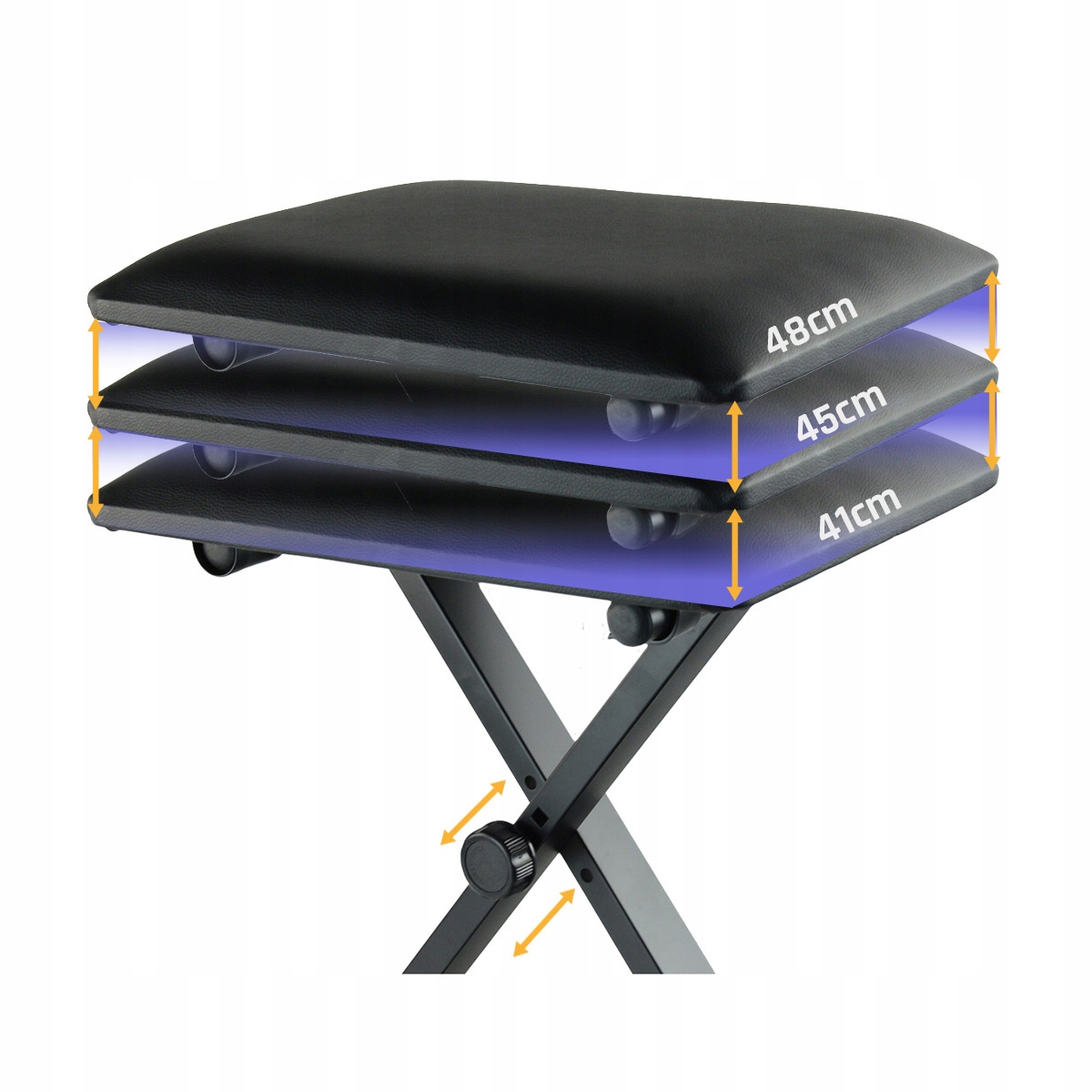Табурет регулюється, що дозволяє регулювати висоту сидіння відповідно до ваших індивідуальних потреб - ви можете вибрати висоту 41-45-48 см. Ця гнучкість робить його придатним як для дорослих піаністів, так і для дітей, забезпечуючи ергономічну та здорову позицію при грі.