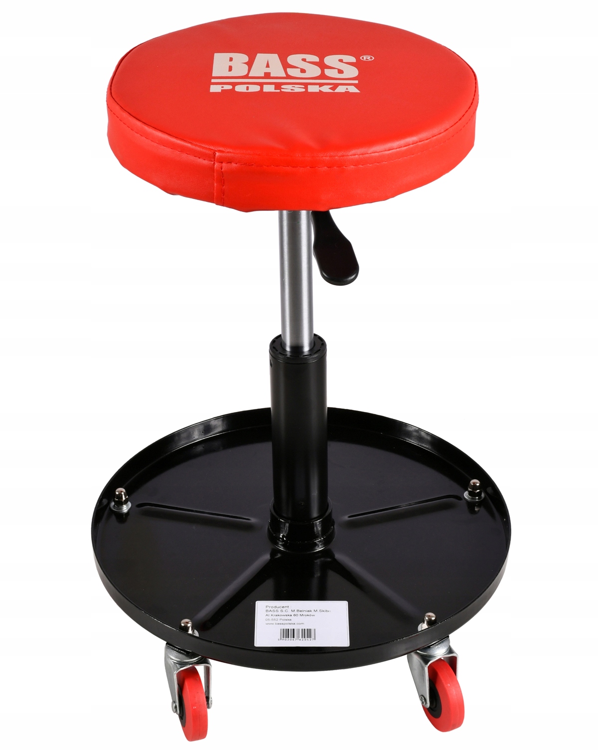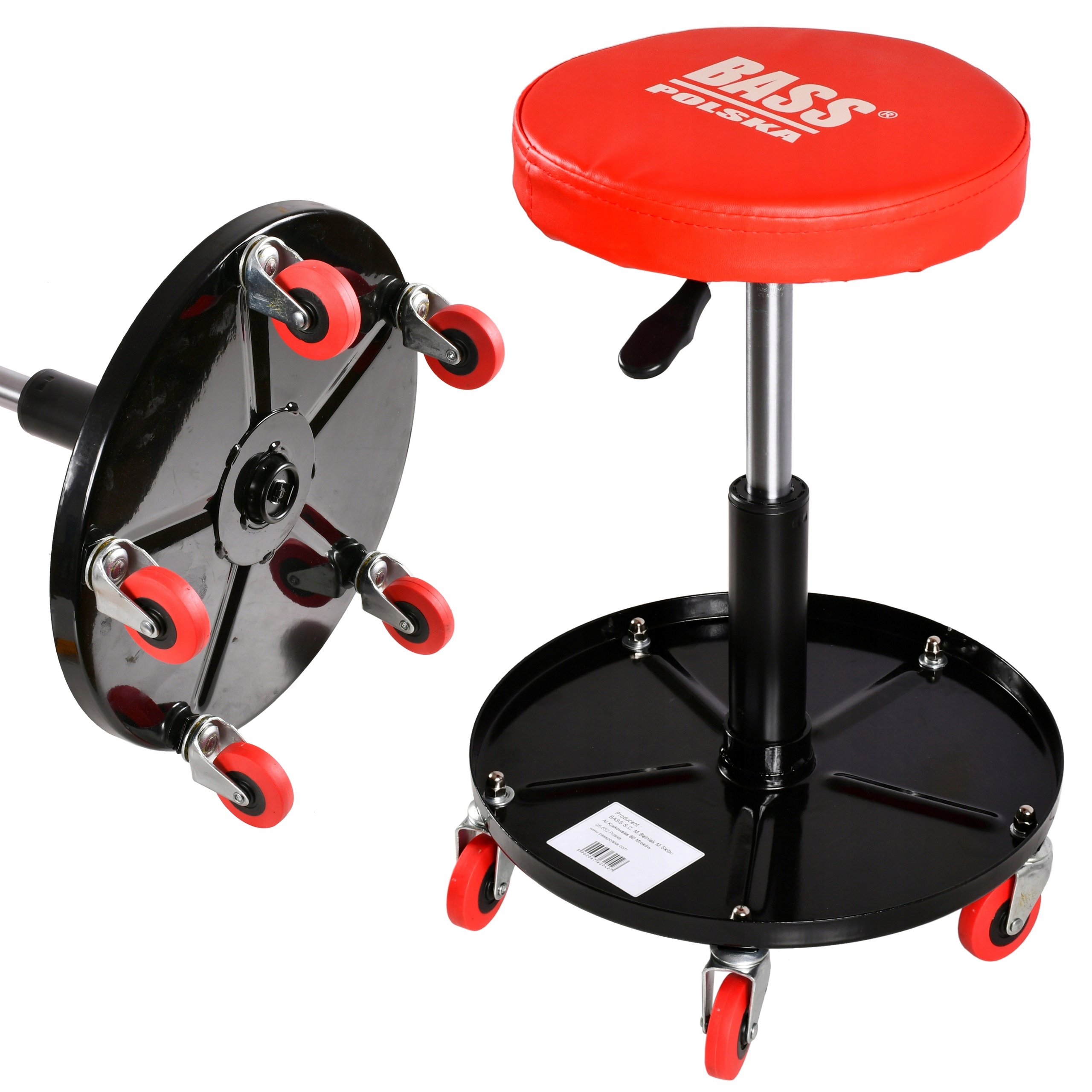 Сидіння з екошкіри з посиленою сталевою конструкцією, з п'ятьма колесами, що обертаються на 360°, що забезпечує свободу руху під час роботи в майстерні.