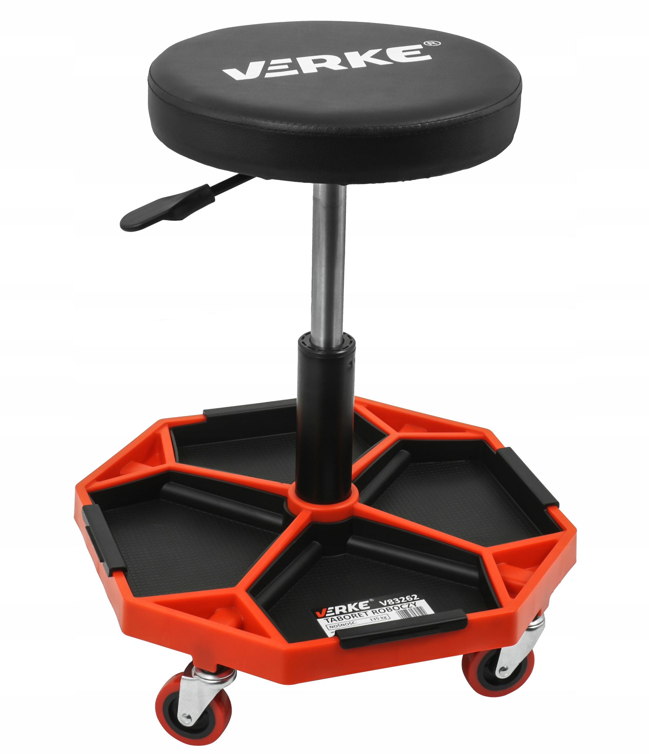 Табурет для майстерень від Verke розроблений для використання в професійних майстернях, автосервісах, ремонтних майстернях, а також чудово підійде в домашньому гаражі. Має поворотне сидіння та 4 поворотні колеса, які підвищують його мобільність. Практичне рішення - обладнати його великою полицею, де механік зможе розмістити інструменти, які використовуються під час роботи. Покриття комфортного сидіння виконано з ПВХ. Завдяки пневматичному регулюванню висоти його можна легко підлаштувати під зріст людини.