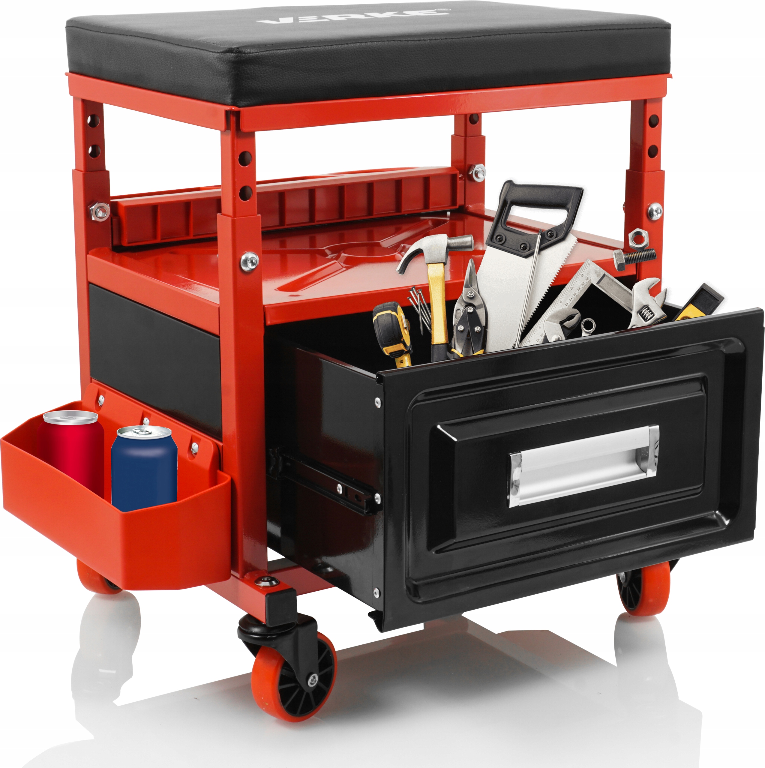 Табурет для майстерні Verke був розроблений для використання в професійних майстернях, автосервісах, ремонтних майстернях, а також чудово працюватиме в домашньому гаражі. Практичне рішення - обладнати його великою полицею і 3 додатковими полицями, де механік зможе розмістити інструменти, які використовуються під час роботи. Покриття комфортного сидіння виконано з ПВХ. Завдяки 4-ступінчастому регулюванню висоти сидіння його можна легко підлаштувати під зріст людини.