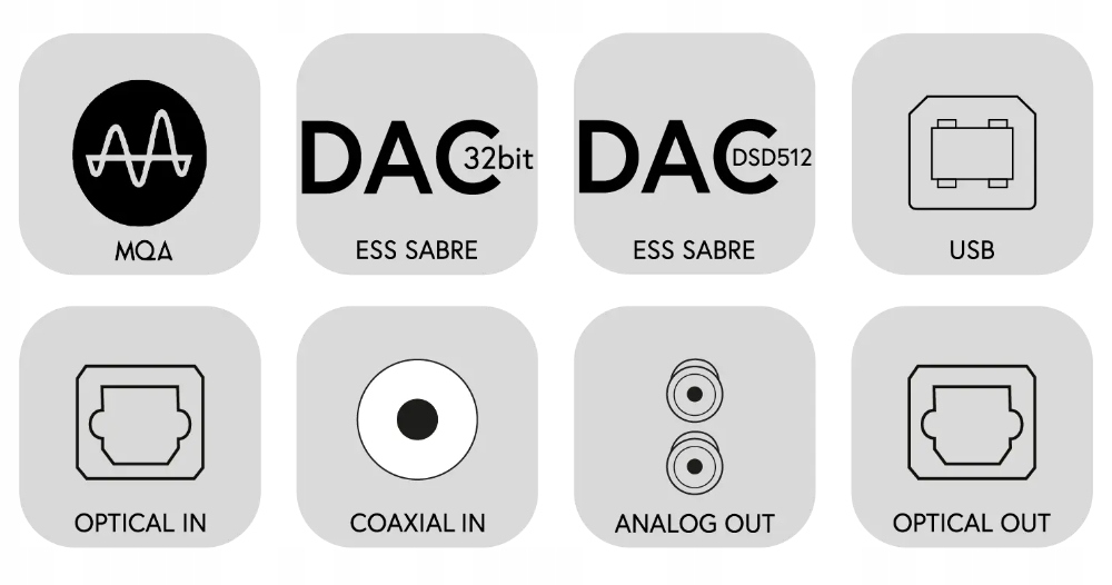 - підтримка цифрових аудіофайлів до 32 біт/768 кГц або до DSD512 для відтворення музики, що зберігається на комп’ютерах, програвачах компакт-дисків, смартфонах та інших пристроях зберігання файлів.
