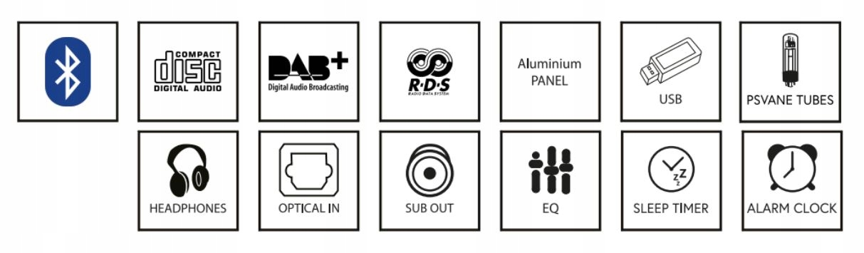 - Функції / обладнання: Будильник Функція сну Еквалайзер Регулювання низьких/високих частот Гучність Super Bass Пульт дистанційного керування Антена DAB+/FM Стереокабель RCA Кабель Europlug-IEC C7