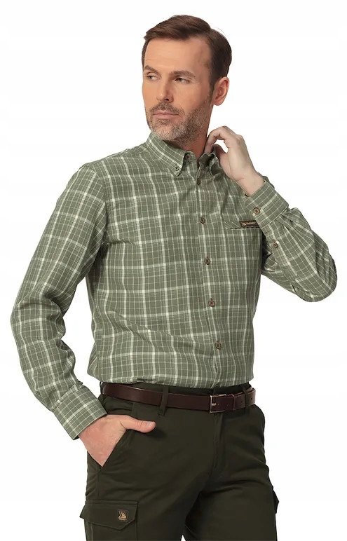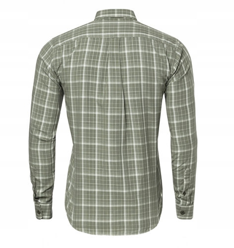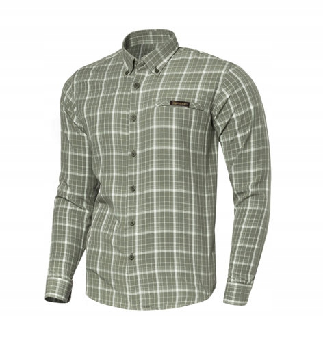 має картаний візерунок з оливковим бежевим. На лівій грудці є вбудована кишеня , яка покрита клаптям, а комір закріплений кнопками.