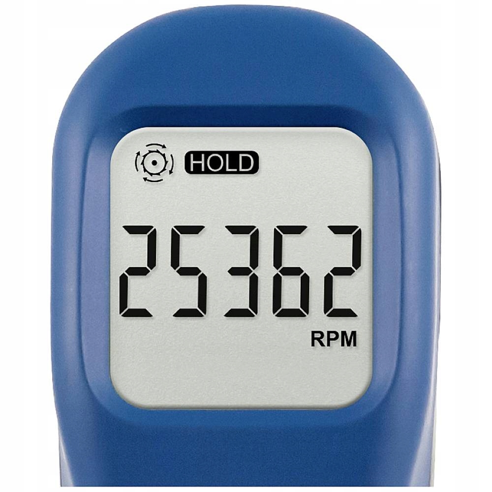 - Додаткові технічні дані: Діапазон вимірювання 2,5... 99,999 об/хв (об/хв) Точність вимірювання ± 0,02% + 1 цифра Роздільна здатність 2,5 ... 999 об/хв: 0,1 об/хв 1000... 99,999 об/хв 1 об/хв Відстань вимірювання 50... 500 мм Швидкість вимірювання 0,5 с (понад 120 об/хв) Пам'ять 60 окремих запам'ятовуваних даних Автоматичне відключення через 20 с Живлення від блочної батареї 9 В Умови експлуатації 0...50°C / 10...90% вологості відп. Умови зберігання -10 ... 60°C / 10 ... 75% вологості відп. Розміри 145x90x35 мм Вага приблизно 120 г (з батареями)