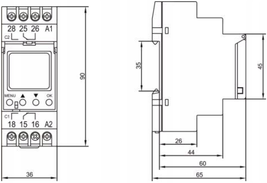 - ширина 2 модулі (2x18 мм), встановлені на рейку DIN TH-35