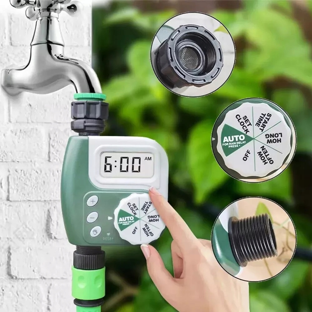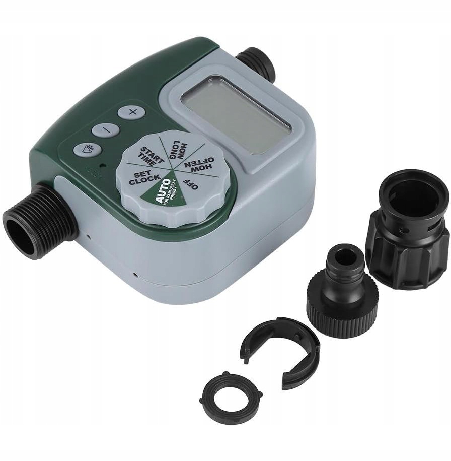 Цей таймер характеризується простим, легким встановленням і програмуванням. Немає необхідності використовувати інструменти. Просто встановіть час початку, тривалість і частоту поливу. Крім того, таймер зберігає програму при заміні батарейок. Велика чітка ручка та РК-екран роблять програмування таким же простим, як азбука!