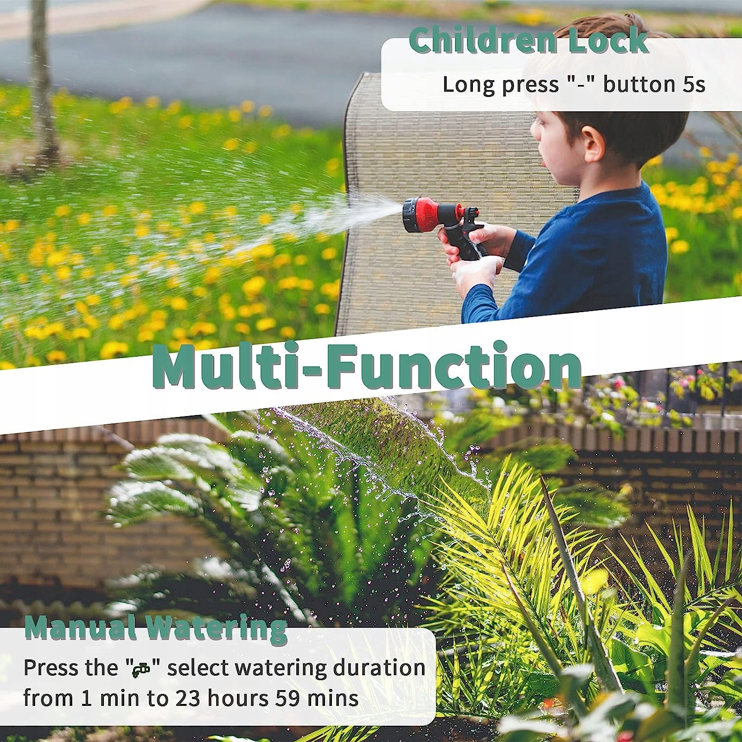 Багатофункціональний таймер поливу: режим затримки дощу дозволяє зробити паузу розклад на 1-7 днів, щоб уникнути переливу та зберегти багато води в дощові дні. Режим ручного поливу дозволяє тимчасово поливати, не перериваючи встановлену програму поливу. Режим блокування від дітей захищає таймер спринклерного поливу від домашніх тварин і дітей.