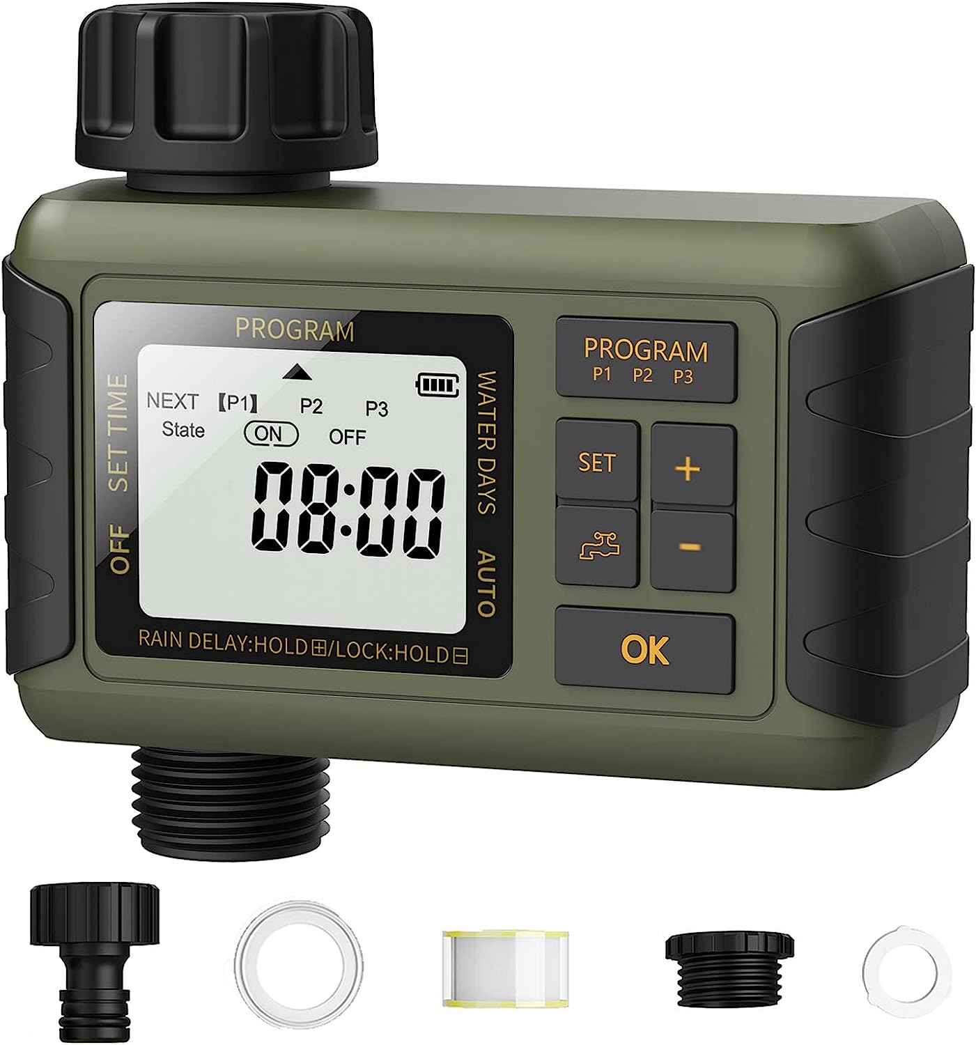 Покращена герметична конструкція: З’єднувачі спринклерного таймера виготовлені з 30% армованого нейлону, який може витримувати високий тиск води від 7,25 psi до 116 psi. Кожен спринклерний таймер постачається з ущільнювальними шайбами 2 різних розмірів і ущільнювальною стрічкою для різьблення для запобігання витокам. Кришка батареї з гумовим кільцем ізолює вологу.