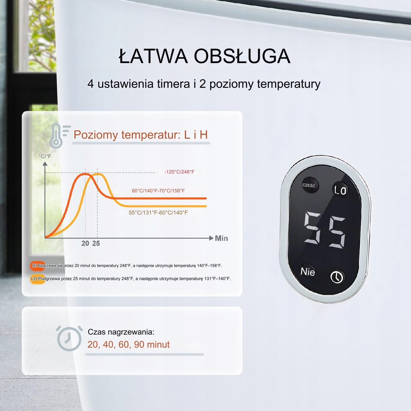 Пристрій пропонує 4 налаштування таймера та 2 рівня температури. Ви можете встановити час нагрівання до 20, 40, 60 або 90 хвилин і відрегулювати температуру на рівнях L і H.