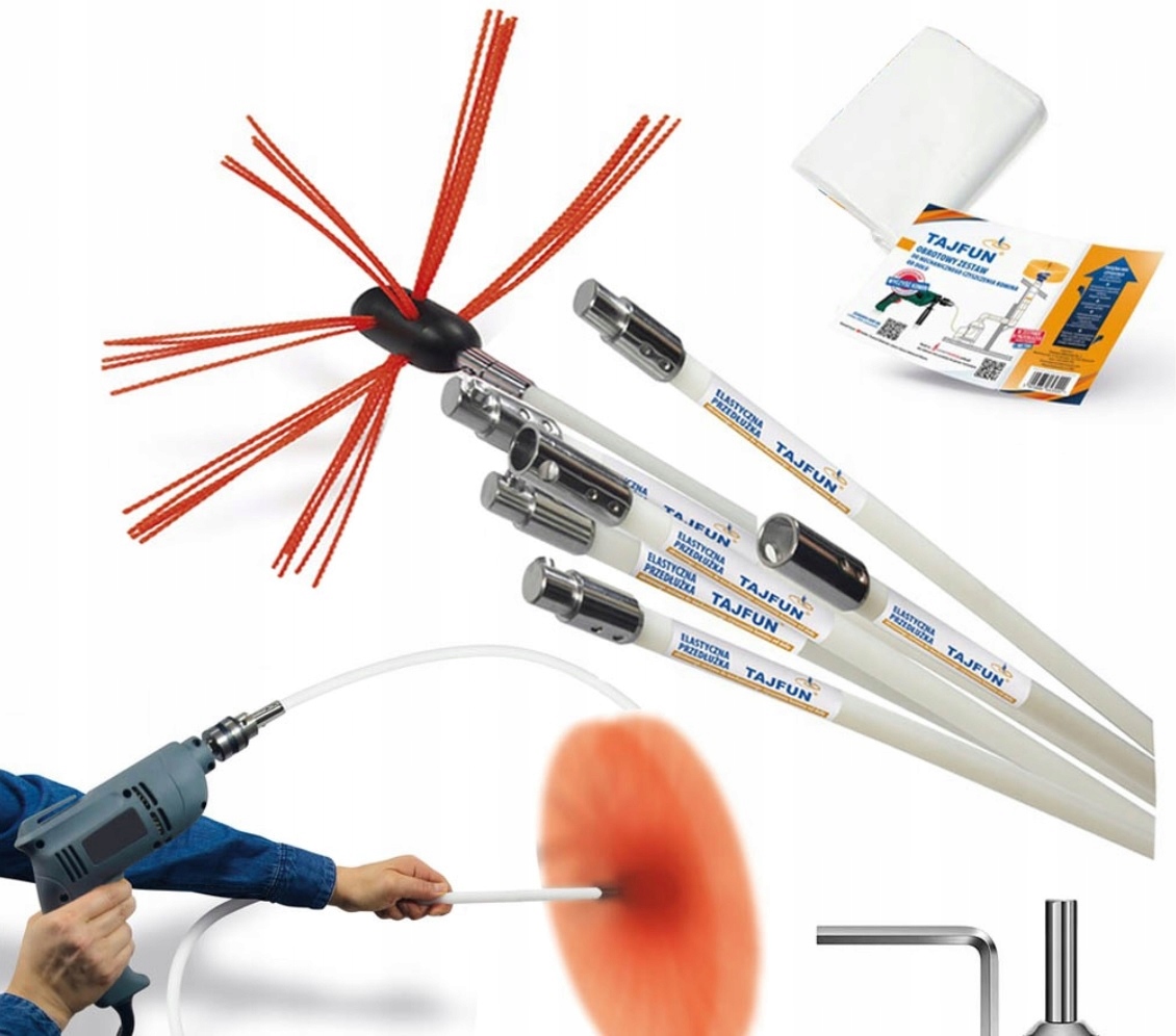 Обертовий набір для механічного чищення димоходу знизу дозволить Вам більше ніколи не користуватися допомогою сажотруса. Завдяки тому, що елементи набору (щітка з жорсткою нейлоновою щетиною, 6 гнучких нейлонових подовжувачів, адаптер для дрилі з ключем) підключаються до дрилі, ви зможете видалити навіть найстійкіші забруднення з якими ви раніше не стикалися. Набір Tajfun I розроблено для видалення легких і помірних відкладень сажі та креозоту, які зазвичай зустрічаються в димоходах.