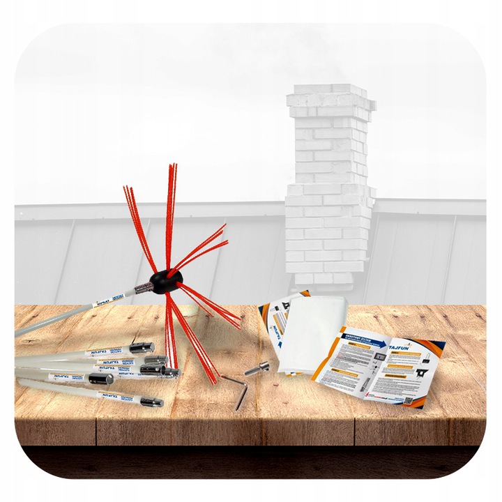 Набір Tajfun використовується для видалення легких або помірних відкладень сажі та креозоту в цегляних та керамічних димоходах будь-якого діаметру та форми.