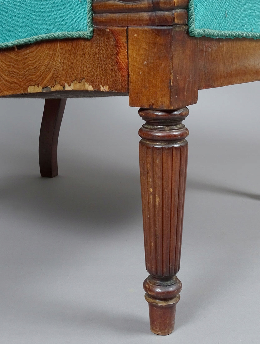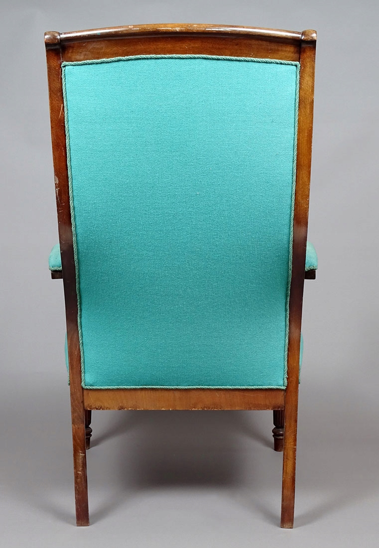 Крісло зі стійкою конструкцією, з втратами шпону з боків біля нижньої планки та потертою оббивкою.