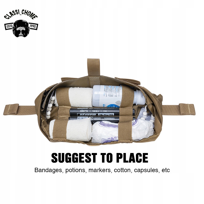 Зовнішні потовщені липучки полегшують кріплення жилета до пояса, що дозволяє швидше знімати аптечки. Зазвичай використовуються для підвішування сумок під жилет закріпити на поясі медичні сумки. Підходить для щоденних поїздок, CS на вулиці, польової зйомки тощо.