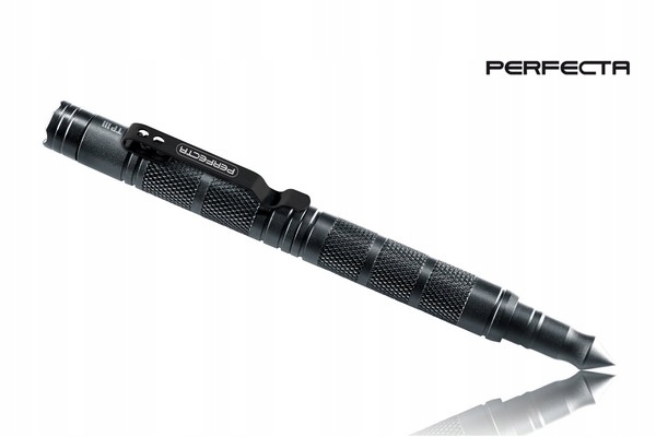 Perfecta Tactical Pen зроблена з армованого матеріалу. алюміній , що робить його практично «непорушним» у щоденному використанні. Алюмінієва текстура проти ковзання забезпечує зручне та надійне тримання при письмі, а також під час екстреного використання. Ручка Perfecta III оснащена агресивним розбивачем скла, який також служить куботаном для самозахисту в екстреній ситуації. Додатковою функцією є невеликий, але досить потужний світлодіодний ліхтарик, що живиться від батарейок CR927.