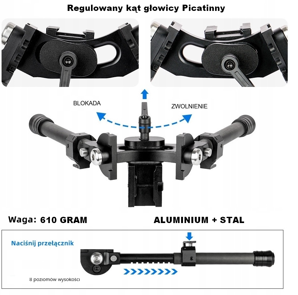 - Регульована висота до 25 см - до 10 рівнів регулювання довжини ніжок дозволяють точно підлаштуватися під потреби стрільця.