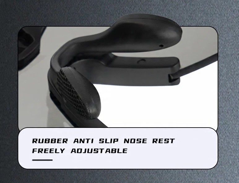 - Ергономічний дизайн: Рамка та храми ергономічно розроблені для забезпечення комфорту навіть під час тривалого зносу. Оснащений гнучкими рамками та регульованими носами, які дозволяють відповідати різним формам обличчя.