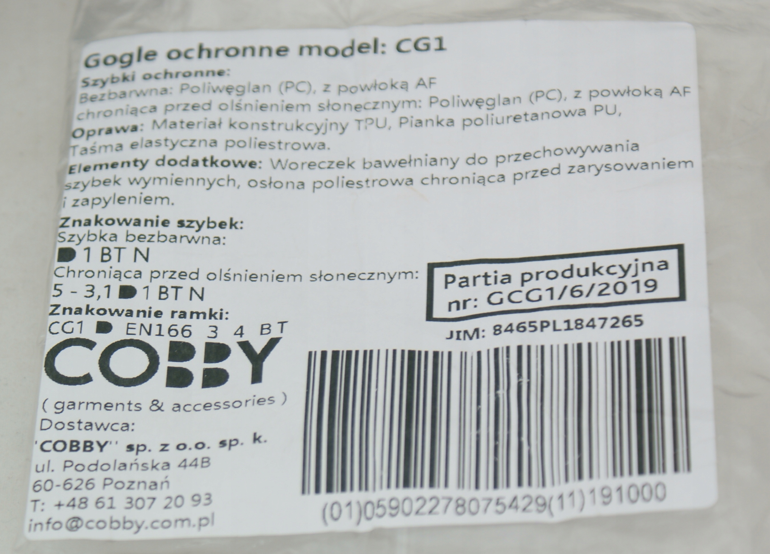 Захисні, тактичні окуляри моделі CG1 зі складських ресурсів Польщі. Відповідно до стандарту PN-EN 166:2005 і скло, і рама позначені символом BT, що означає, що вони витримують прямий удар об’єкта вагою 0,86 г, який рухається зі швидкістю 120 м/с при температурі від -5°C до +55°C.