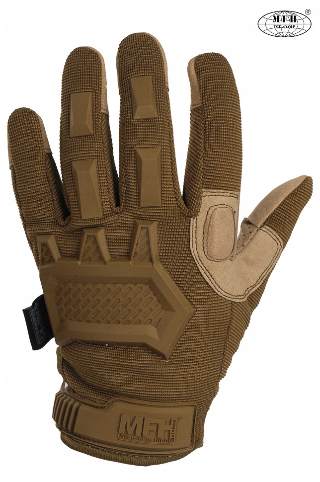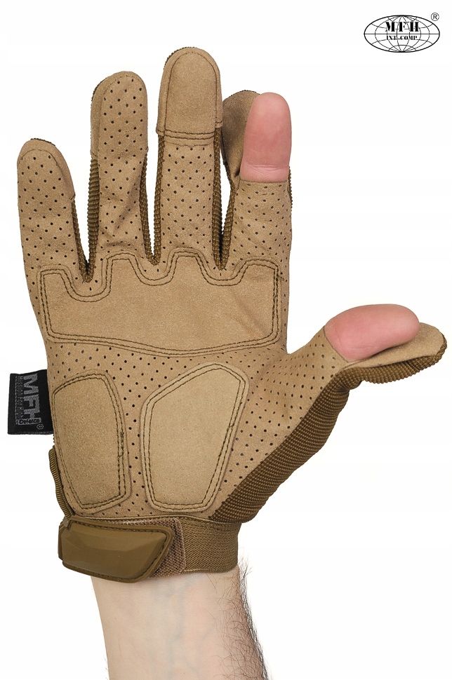 Удосконалені тактичні рукавички 3-го покоління. Продукція німецького бренду MFH. Військова специфікація гарантує безкомпромісні рішення. Сучасний дизайн, адаптований до рукопашного бою, бойових дій, чорно-зеленої тактики. Рукавички з міцних сучасних матеріалів, таких як нейлон, поліамід, поліуретан і благородна синтетична шкіра. Вони забезпечують гарне захоплення та захист рук, зберігаючи при цьому високий комфорт. Вони мають великі пальці, що відкриваються, і спусковий гачок для полегшення роботи з електронікою, захист суглобів пальців, захист фаланг і посилення рукоятки. Рукавички призначені для використання при високих і помірних температурах.