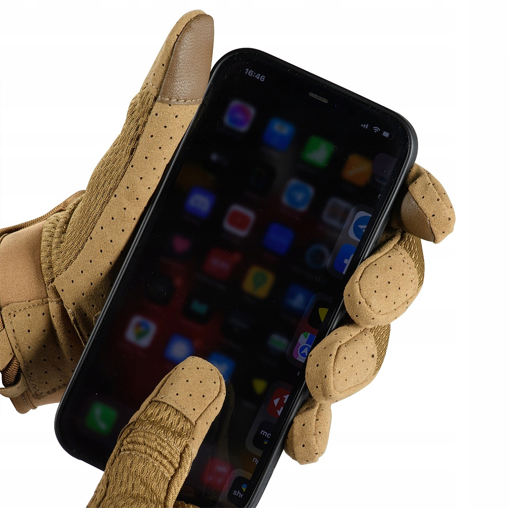 Стійкі тактичні рукавички з нейлону, поліестеру та гуми. Завдяки анатомічному крою вони добре лягають на руку та забезпечують свободу рухів. Технологія TouchScreen, яка використовується на великому та вказівному пальці, дає змогу керувати сенсорними пристроями, не знімаючи рукавичок.