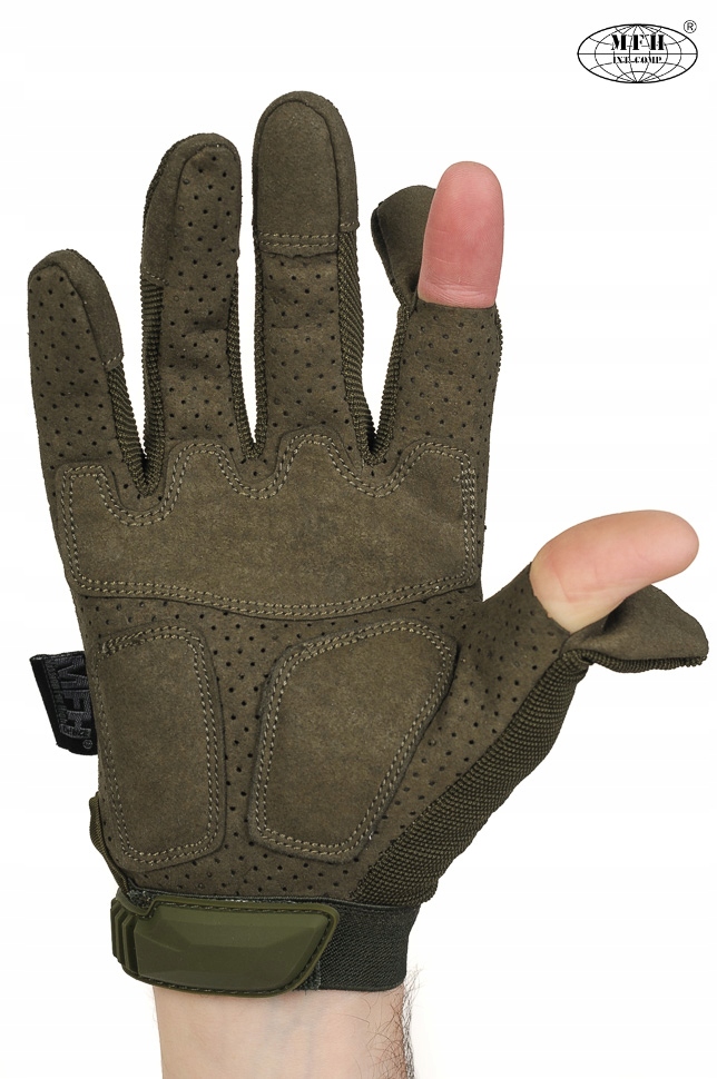 Удосконалені тактичні рукавички 3-го покоління. Продукція німецького бренду MFH. Військова специфікація гарантує безкомпромісні рішення. Сучасний дизайн, адаптований до рукопашного бою, бойових дій, чорно-зеленої тактики. Рукавички з міцних сучасних матеріалів, таких як нейлон, поліамід, поліуретан і благородна синтетична шкіра. Вони забезпечують гарне зчеплення та захист рук, одночасно забезпечуючи високий комфорт. Вони мають великі пальці, що відкриваються, і спусковий гачок для полегшення роботи з електронікою, захист кісточок пальців, захист фаланг і посилення рукоятки. Рукавички призначені для використання при високих і помірних температурах.