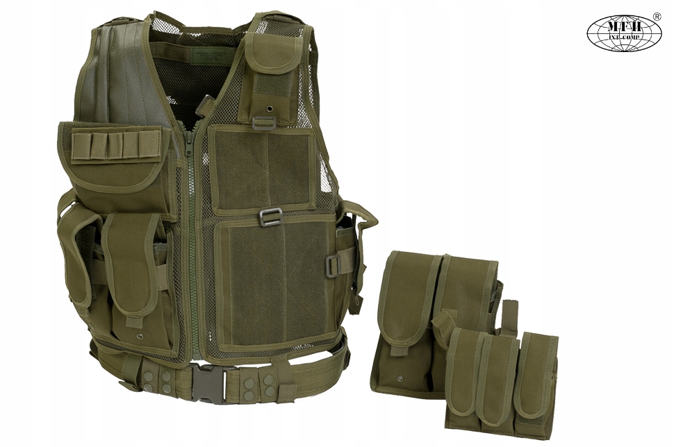 Тактичний жилет призначений для спеціальних підрозділів Корпусу морської піхоти США. Продукт німецької компанії MFH Int. Comp. Культова модель USMC, друге покоління, збагачена змінними модульними панелями. Оснащений тактичним поясом, кобурою та підсумками. Нашита на міцну дихаючу сітку, що значно підвищує комфорт використання та запобігає перегріву. Інстинктивно розміщені сумки та кишені, можливість адаптувати жилет до індивідуальних потреб. На грудях справа є кишеня для дрібного спорядження, а на клапані кишені застібка-липучка для пластової нашивки. Права панель на череві з трьома підсумками в системі CQB - для шести магазинів до карабінів M16, M4, G3, G36. Підсумки вміщують по одному магазину АК, а також підходять для пейнтбольної зброї. Регулювання висоти клапана дозволяє регулювати розмір мішків відповідно до ваших потреб. Навколишні гуми утримують магазини, коли кришка повністю відкрита (CQB). Ліва черевна та грудна панелі в модульній системі (липучки + стрічки) з можливістю змінного кріплення підсумків або кобур. Модульна панель з підсумками CQB для трьох магазинів пістолета. Підсумки для пістолетів регулюються за розміром, можна використовувати як кишеню для канцелярського ножа або ліхтарика Велика модульна панель для довгих магазинів для зброї, призначена для кріплення на животі. Універсальна, регульована кобура модульної системи, кріпиться на груди або живіт. Кобура оснащена додатковою сумкою і подвійною системою безпеки. Жилет оснащений підсумками для п'яти патронів до гладкоствольної зброї, які кріпляться в будь-якому місці на жилеті (липучки). Задня панель з вшитими стрічками для кріплення обладнання в системі MOLLE. Оснащений евакуаційною ручкою (вушком для витягування постраждалого). Задня частина з великою прихованою кишенею для балістичної вставки або, наприклад, верблюжої вставки. Праве плече оброблене штучним нековзким матеріалом з м'яким наповненням (менша чутливість до віддачі зброї). Гнучкий стрижень, який запобігає зісковзуванню приклада навіть у незручному положенні для стрільби, наприклад, на боці. На лівому плечі кишеня для спорядження. Металеві D-кільця для підвішування зброї або, наприклад, шланга Camelback. Повне, швидке регулювання по горизонталі - універсальний розмір. З внутрішньої сторони на рівні живота є кишені на блискавці для балістичних вкладишів або, наприклад, карт. У комплект входить професійний тактичний ремінь з регулюванням і липучками. Оснащений міцною пряжкою з ABS і двома додатковими кишенями. Нижній край жилета оснащений двопатентною (застібка і липучка) системою шлевок, які дозволяють швидко відстібати ремінь, не знімаючи жилета. Кишені та сумки, оснащені заклепками та отворами для виливання води з них у разі, наприклад, падіння у воду. Пряжки з міцного АБС, липучки, міцні блискавки та міцне шиття гарантують довговічність.