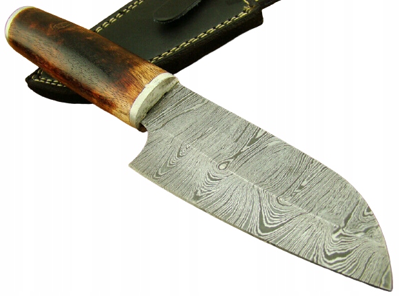 Клинок із дамаської сталі, викуваний із 374 шарів сталі 15N20 та 1095, загартований до 57-59 HRC.