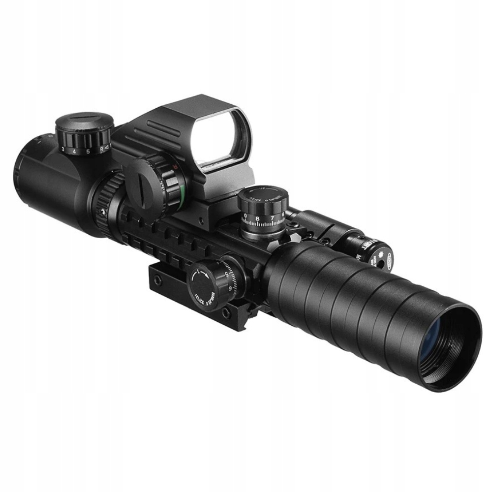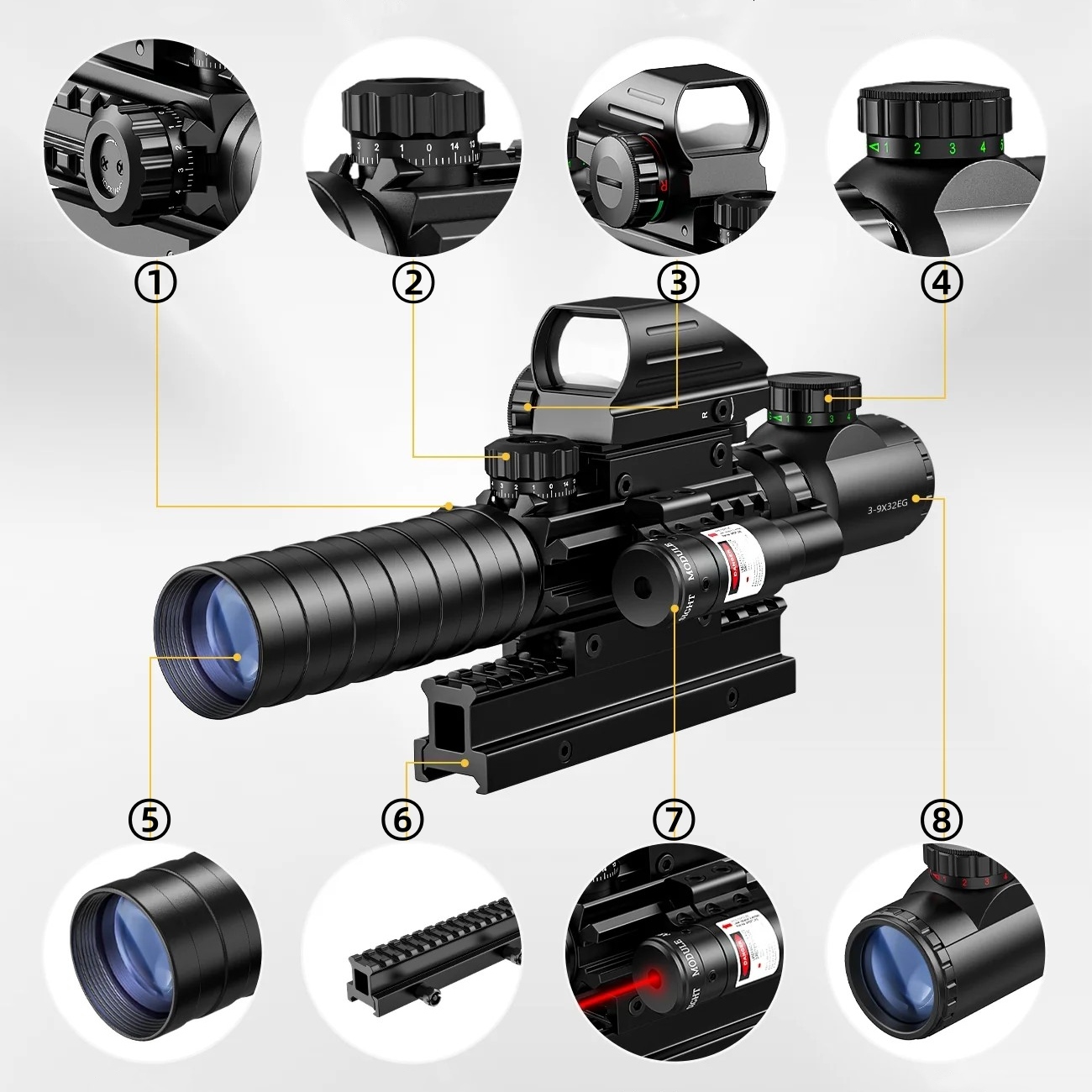 КОМБІНОВАНИЙ ПРИЦІЛ 3-9X32 4-В-1 З ПОДВІЙНОЮ ОПТИКОЮ З ПІДСВІЧУВАННЯМ, 4 ЧЕРВОНИМИ/ЗЕЛЕНИМИ ГОЛОГРАФІЧНИМИ ВТЯГАМИ, ЛАЗЕРНИМ ПРИЦІЛОМ IIIA/2 МВт, ПРИЦІЛОМ З ПІДСВІЧЕННЯМ ТА 20-ММІ КРОНШТЕЙНОМ