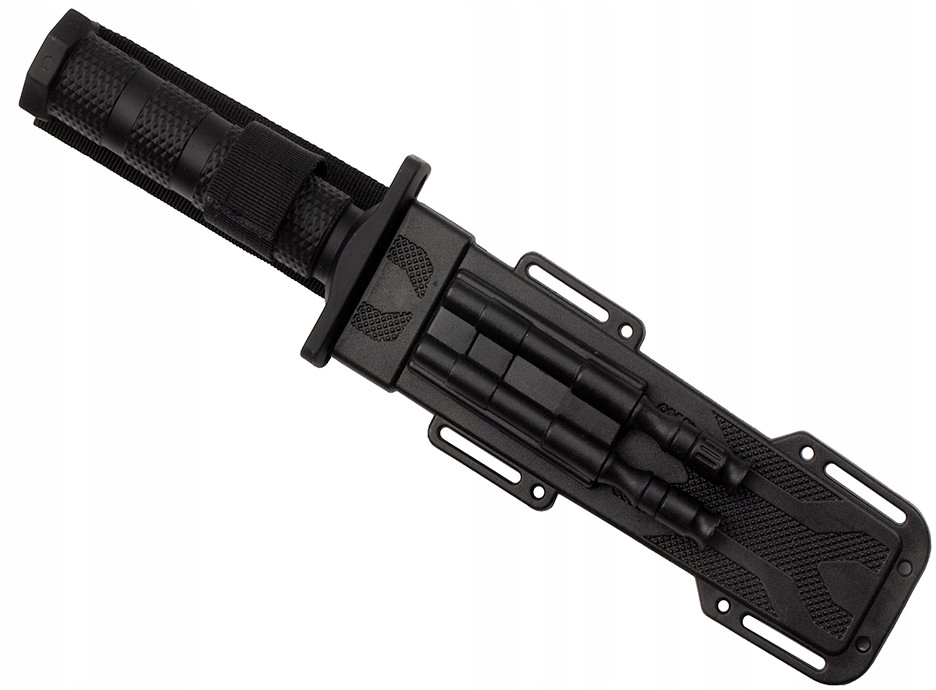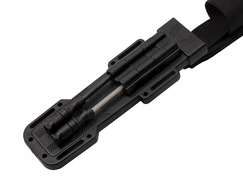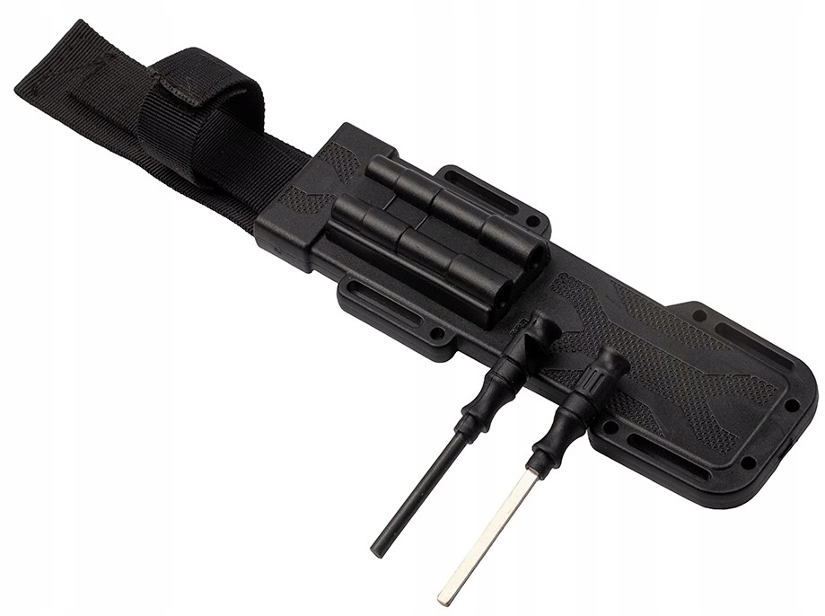 Багатофункціональні піхви містять розпалювач вогню з сигнальним свистком і невелика точилка, за допомогою якої можна легко заточити ніж за будь-яких обставин.