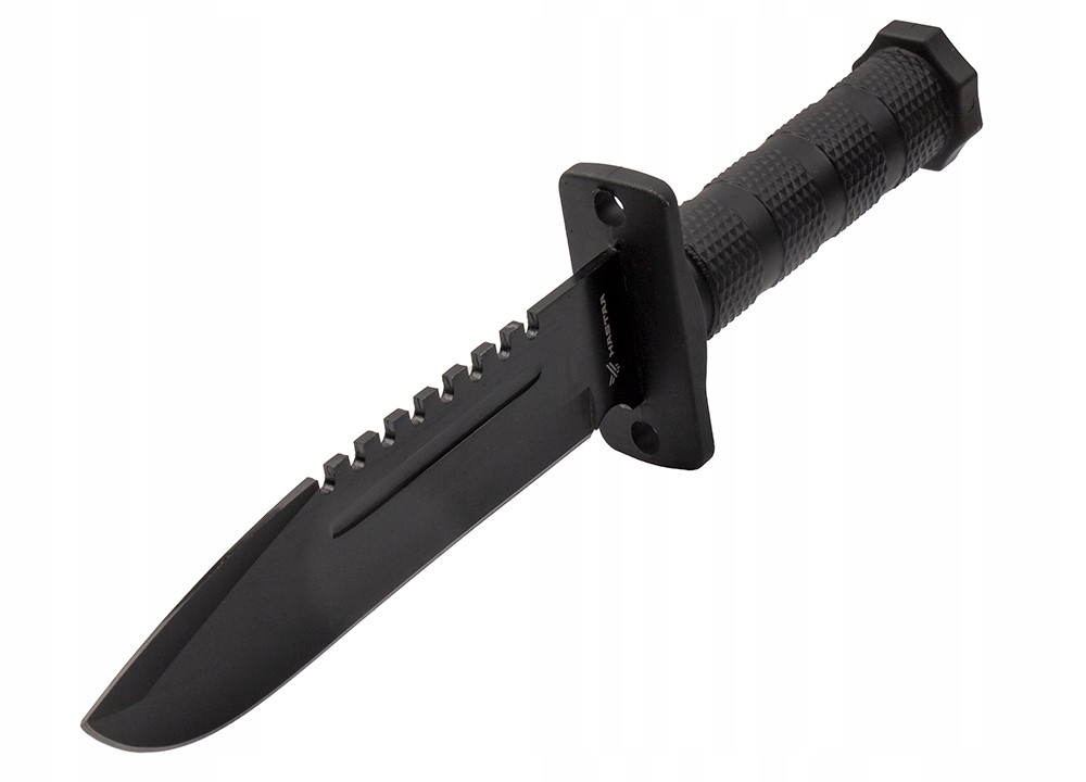 Чорний військовий ніж оснащений зубцями на спині, які виконують роль універсальної пилки.