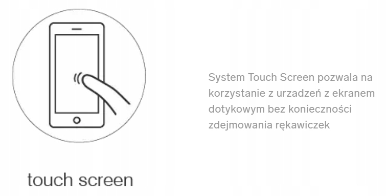 - Система сенсорного екрану, розташована на вказівному та великому пальці, дозволяє комфортно користуватися пристроями з сенсорним екраном.