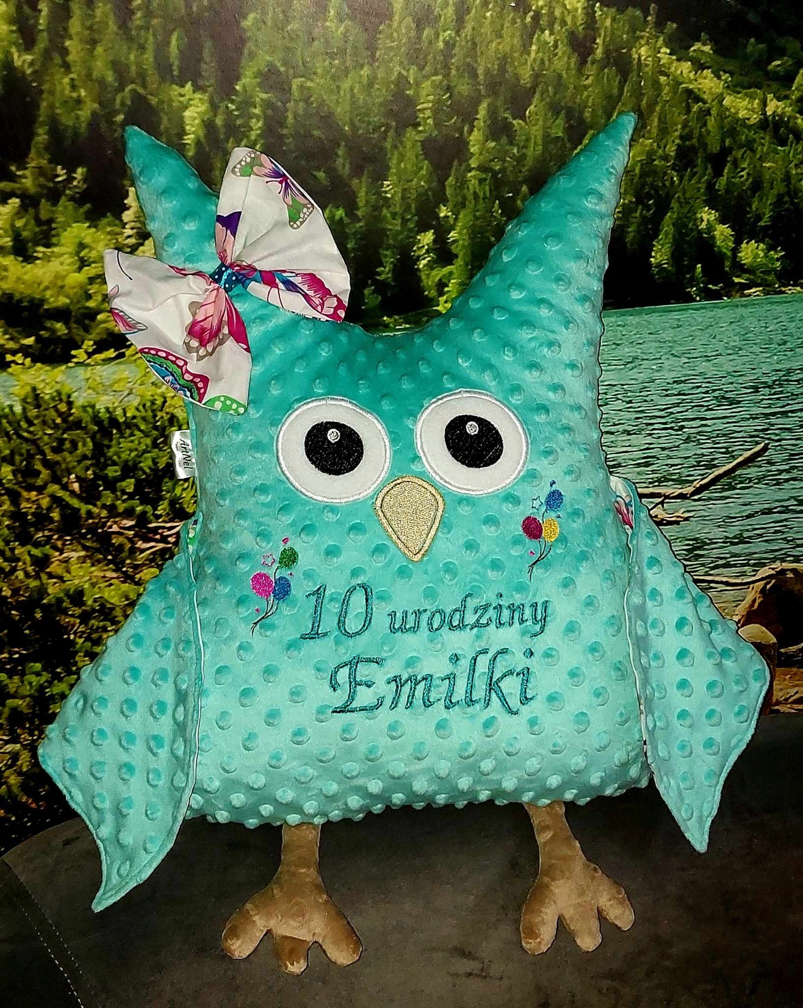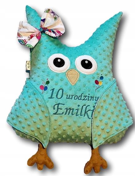 декоративна подушка на день народження сови з назвою та побажаннями на животі. бавовна, наповнений анти -алергічною силіконовою кулею.