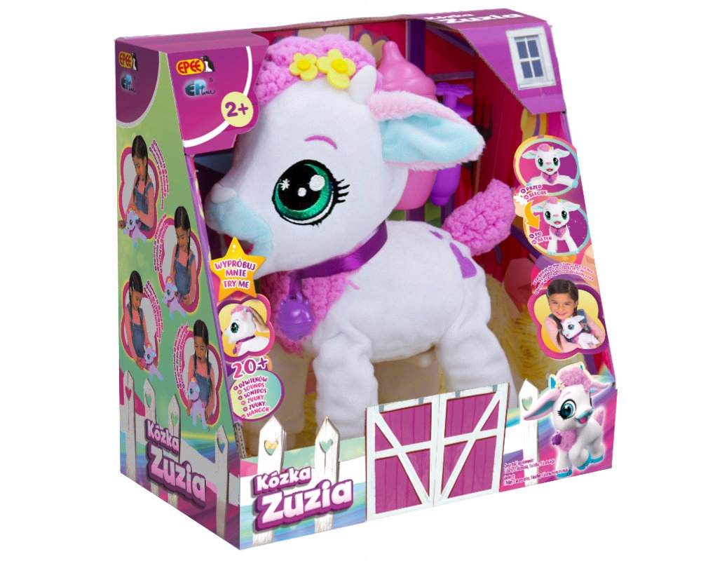 Інтерактивна коза Зузії - це виконання мрій кожної дівчини, яка любить тварин. Іграшка розвиває великі навички догляду та гарантує велику забаву. Це видає понад 20 звуків, реагує на погладжування. Коли ви годуєте його молоком з пляшки, він отримає сили і встане на ногах.