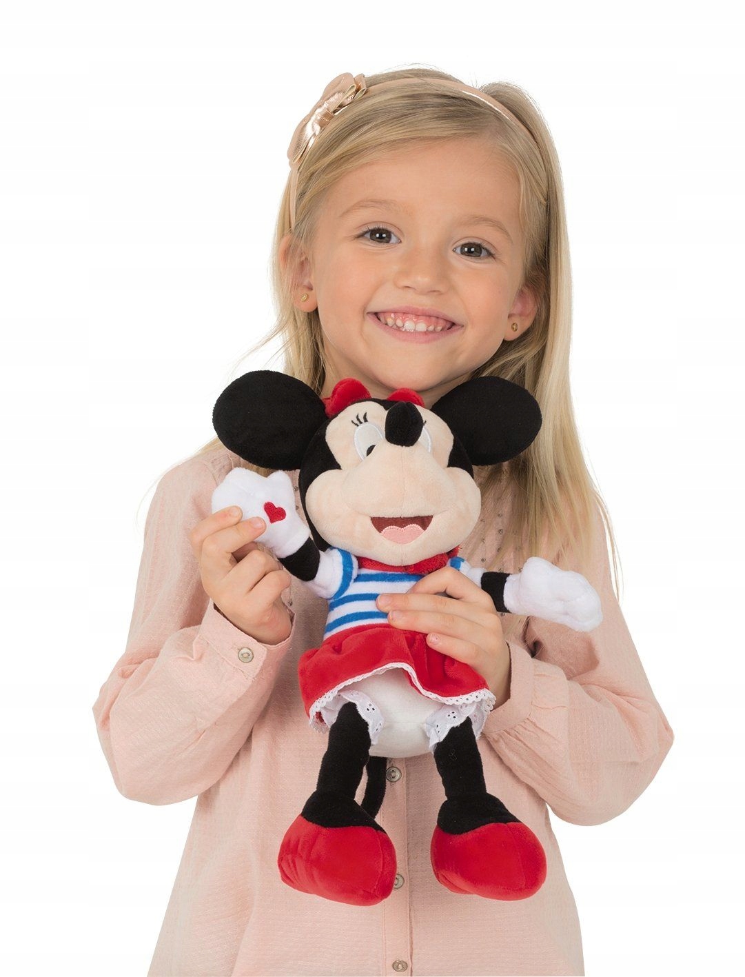 У опудала тварини великі чорні м’які вушка, вишиті очі та широка посмішка. Голову Мінні додатково прикрашає красивий червоний бант. Іграшка виготовлена з приємного на дотик плюшу. Плюшева мишка розміщується в положенні стоячи і має розміри приблизно 32 см (включаючи вушка). Він, безумовно, швидко стане однією з улюблених м’яких іграшок вашого малюка, з якою вони зможуть разом досліджувати світ.