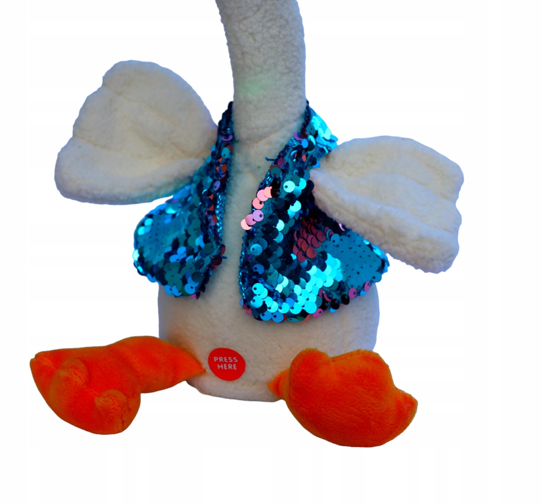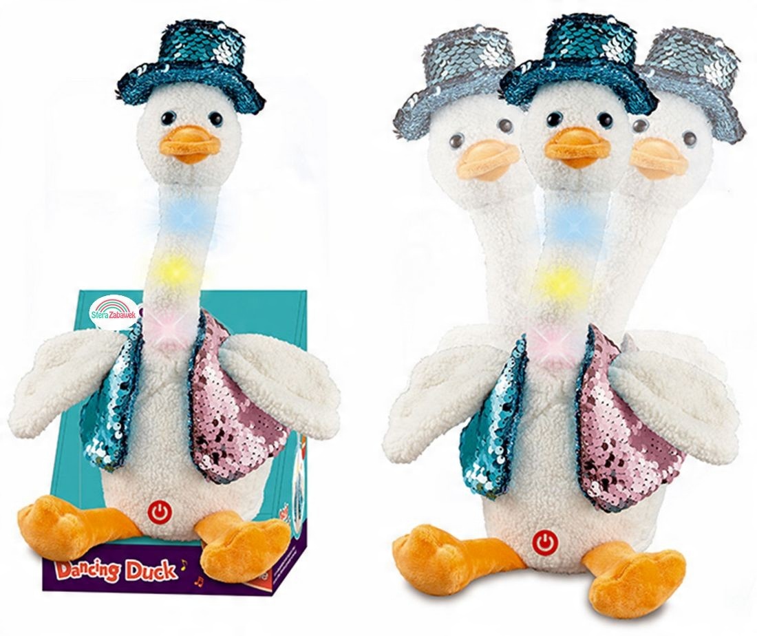 Відкрийте для себе чарівність танцюючої качки - чудової розваги для маленьких дітей. Ця плюшева качечка не тільки танцює, співає і світиться, а й повторює слова малюка. Він має 60 попередньо завантажених пісень, змінний капелюх із блискітками та пальто, іграшку для посмішок і радості.