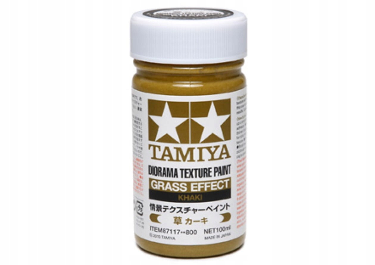Хакі з ефектом трави. Ця фарба з ефектом трави на водній основі має кольорові волокна товщиною 5 мм для відтворення сухих трав’яних поверхонь, і її найкраще використовувати поверх шару текстурної фарби Diorama (ефект ґрунту).