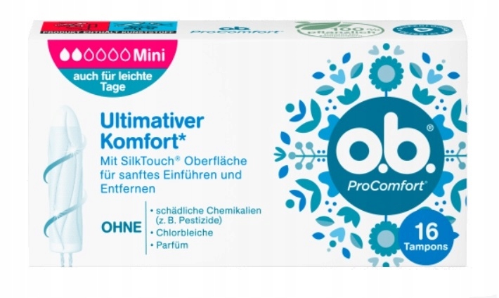 О.Б. тампони ProComfort забезпечує легке нанесення завдяки покриттю SilkTouch і надійний захист завдяки революційній технології DynamicFit з розширенням 3D, завдяки якій тампон o.b. пристосовується до вашого тіла та ефективно захоплює рідину, спрямовуючи її через переплетені канавки всередину та вверх по тампону.Тампони дуже маленькі, вузькі та мають тонкий кінчик, що полегшує їх застосування. Завдяки цьому вони дуже прості та зручні у використанні навіть у дні меншої кровотечі та коли ви тільки починаєте користуватися тампонами. Тампони o.b. ProComfort Mini підходять для днів легкої або помірної кровотечі та для дівчат, які починають користуватися тампонами.