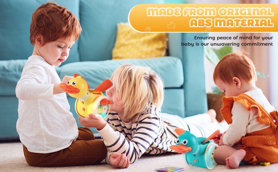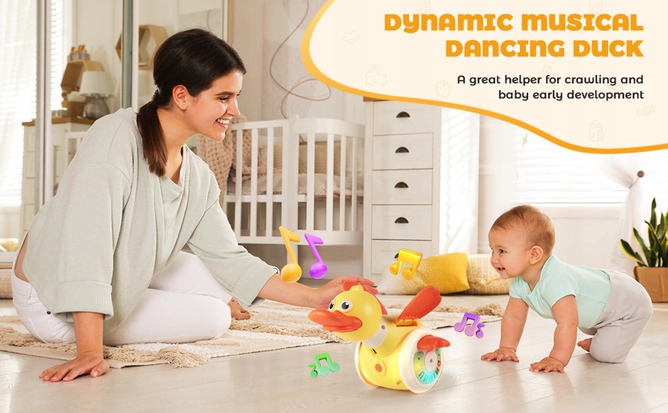 - 【Смішні та звикаючі танцювальні дії】: Ця іграшка з качкою для немовлят оживає завдяки 360 градусів та танцювальних рухах, що імітують годування качок. Немовлята та маленькі діти люблять переслідувати його, заохочуючи його грати в активні та просувальні вправи, забезпечуючи при цьому розваги. 4 Звукові ефекти - це заспокійливі та заспокійливі для немовлят, що робить його чудовою іграшкою як для дня, так і для нічного відпочинку.