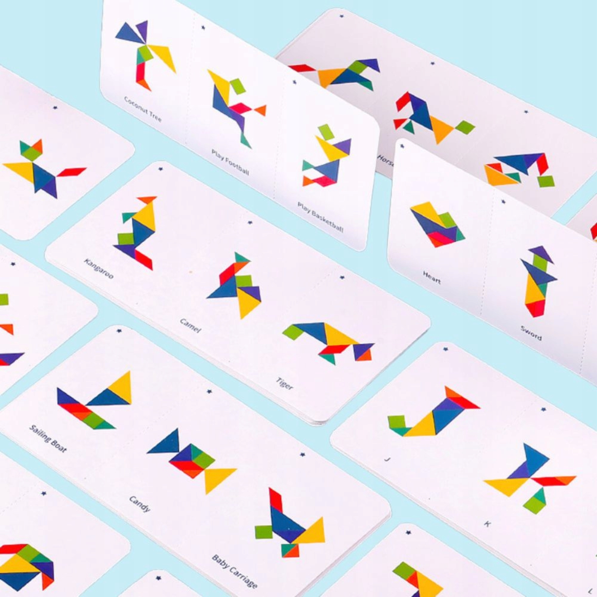 Набір містить аж 40 міцних двосторонніх карток, завдяки яким складати танграми стає ще цікавіше. Кожна картка має два рівні складності: