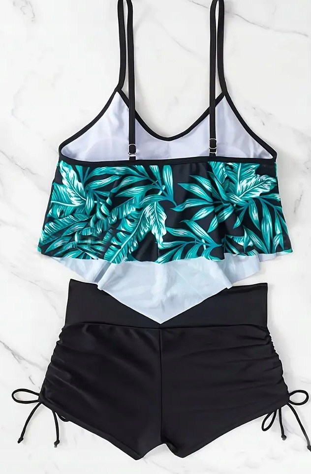 насолода елегантністю та зручністю, включаючи модний два -купальник з двома для підйому ! Тропічний візерунок у відтінках зелені на чорному тлі надає йому екзотичний шарм , а вільна, повітряна гора з тонкими ремінцями тонко підкреслює фігуру. Вам сподобається: