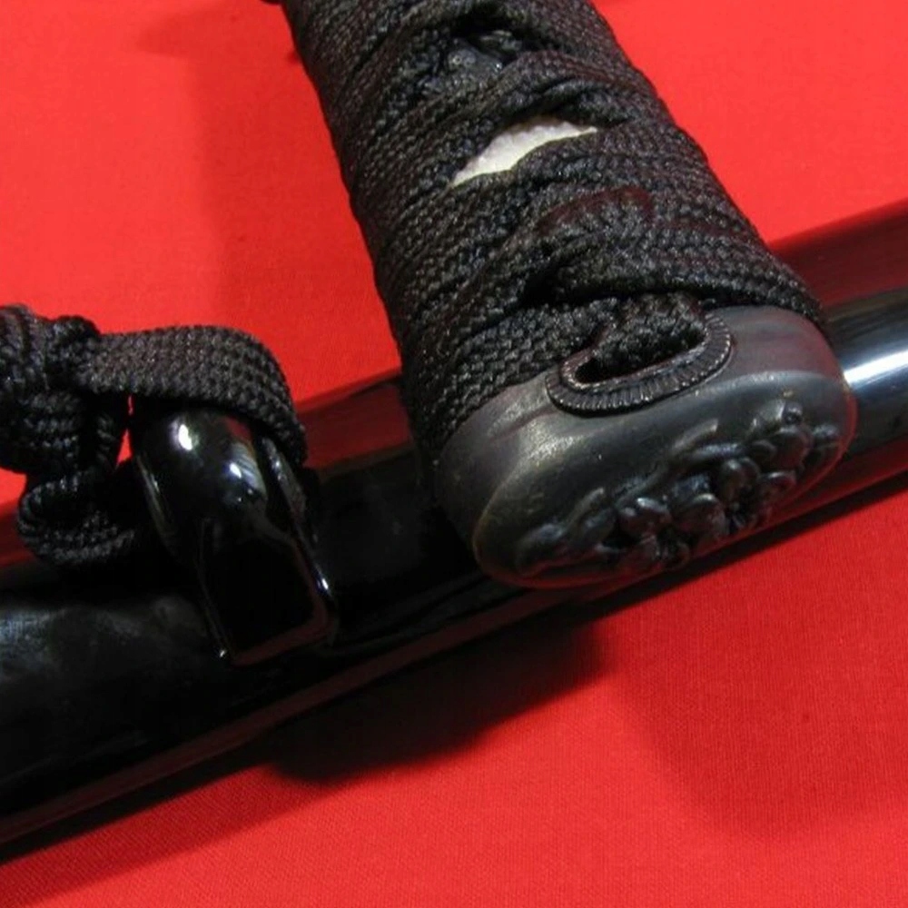 - Цука: (Ручка) Дерев’яне ядро, загорнуте в справжню шкіру з рейду (Самагава) з чорною косою - Ito. Тантоване лезо закріплене одним Мекугом (бамбуковий дюбель). Ви можете демонтувати лезо від ручки, витягнувши цей дюбель. На одній стороні цукі (ручки) є менукі (орнамент під косою). Кінець ручки (Кашира) і Фучі чорний.