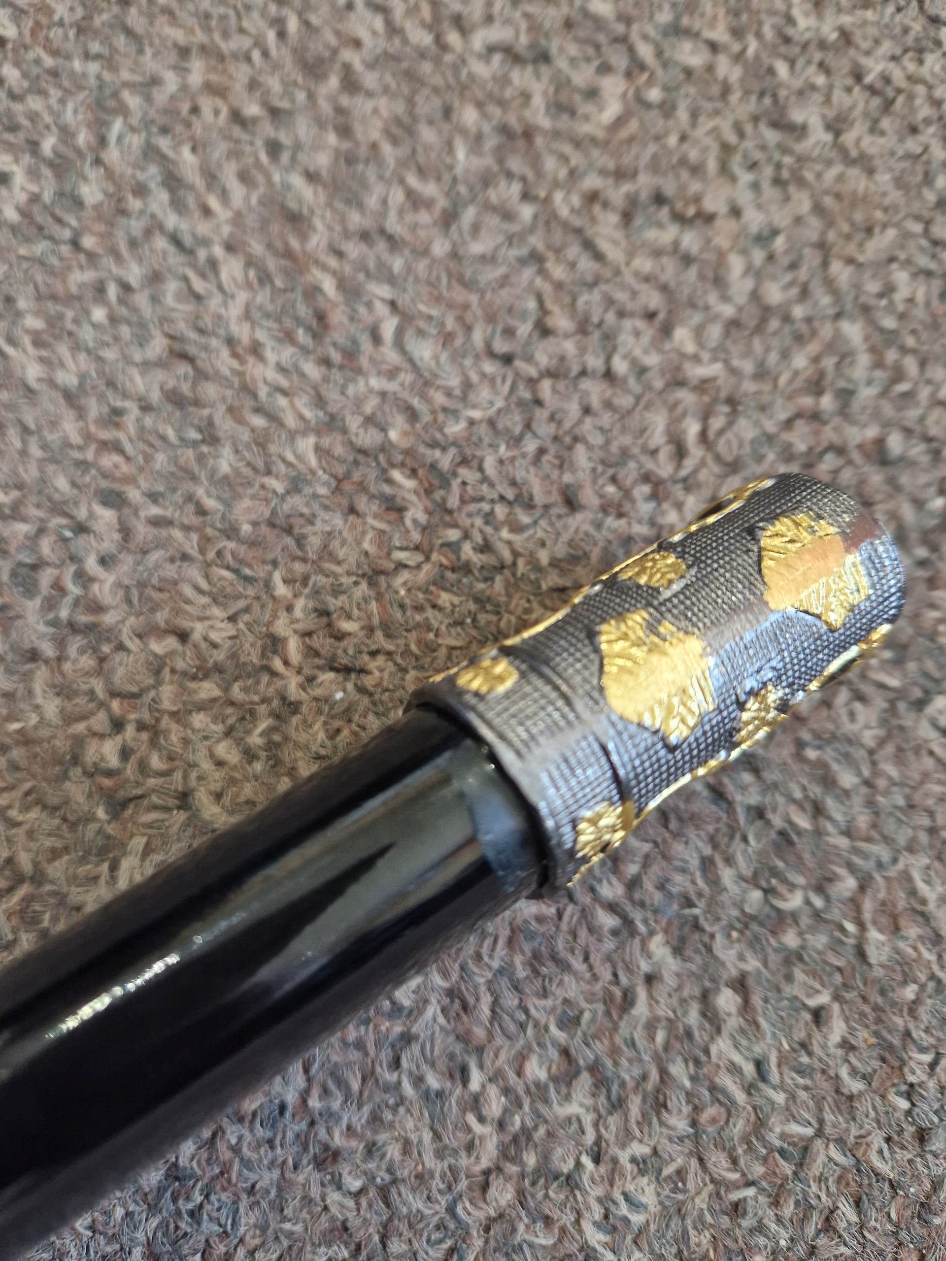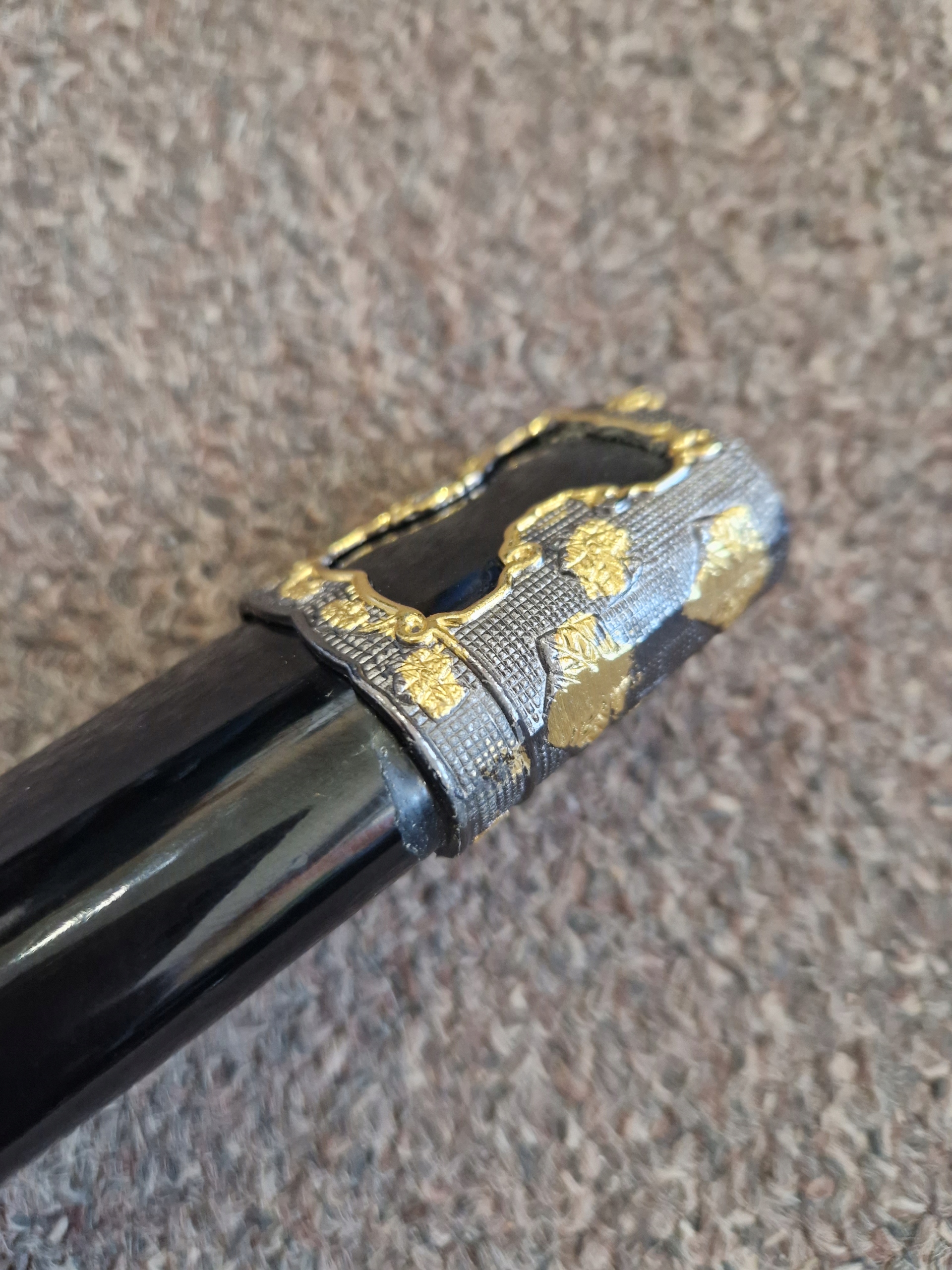 - НОЖНИ/ САЯ: Тверда деревина, розписана вручну в чорний колір, ручна різьба, чорна бавовняна оплетка на ручці, імітація шкіри ската, метал цуба.