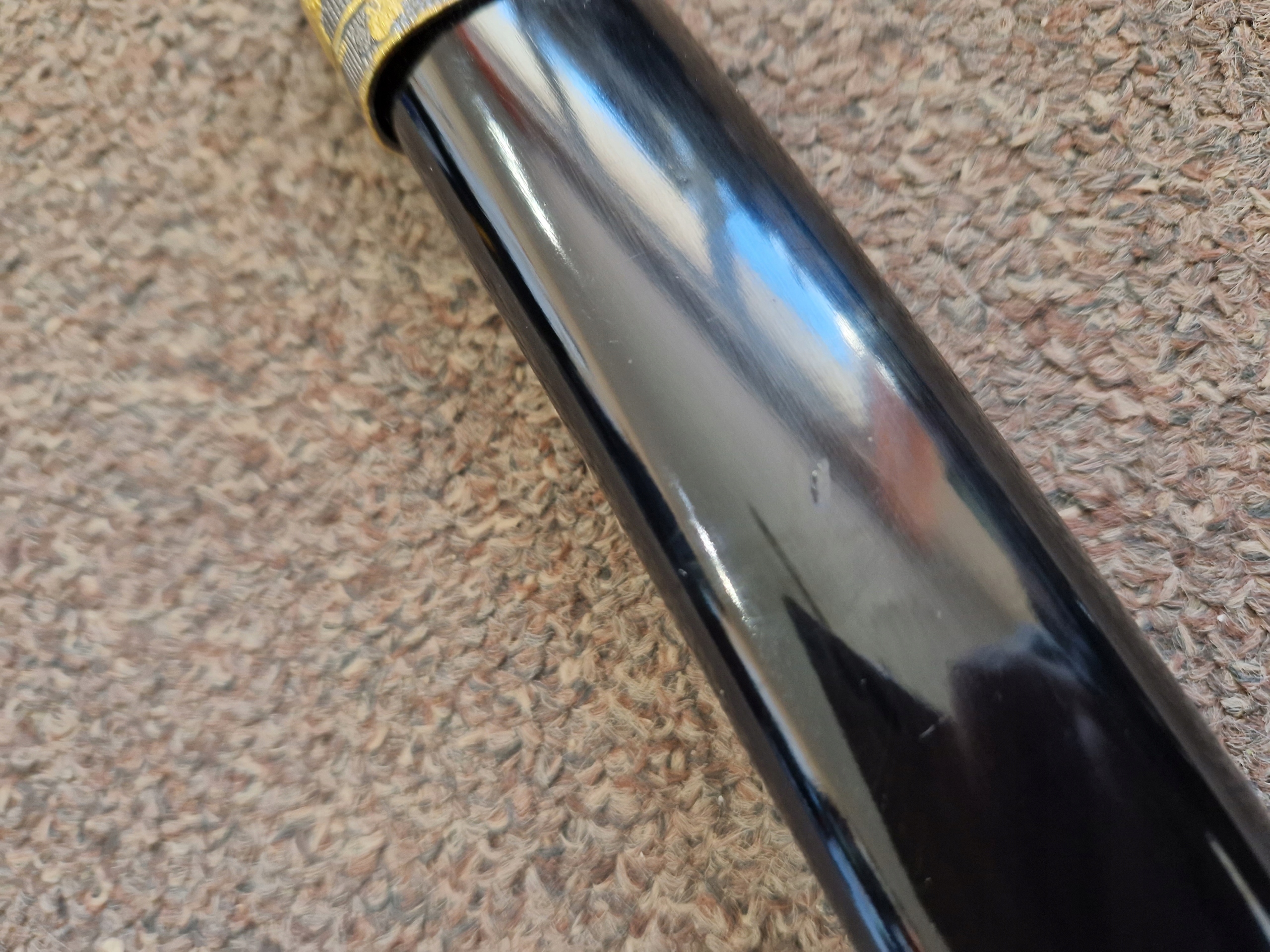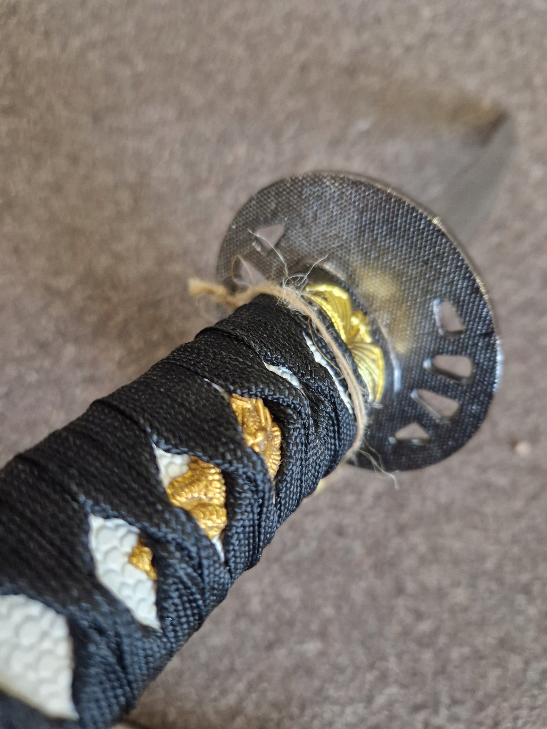 - НОЖНИ/ САЯ: Тверда деревина, розписана вручну в чорний колір, ручна різьба, чорна бавовняна оплетка на ручці, імітація шкіри ската, метал цуба.