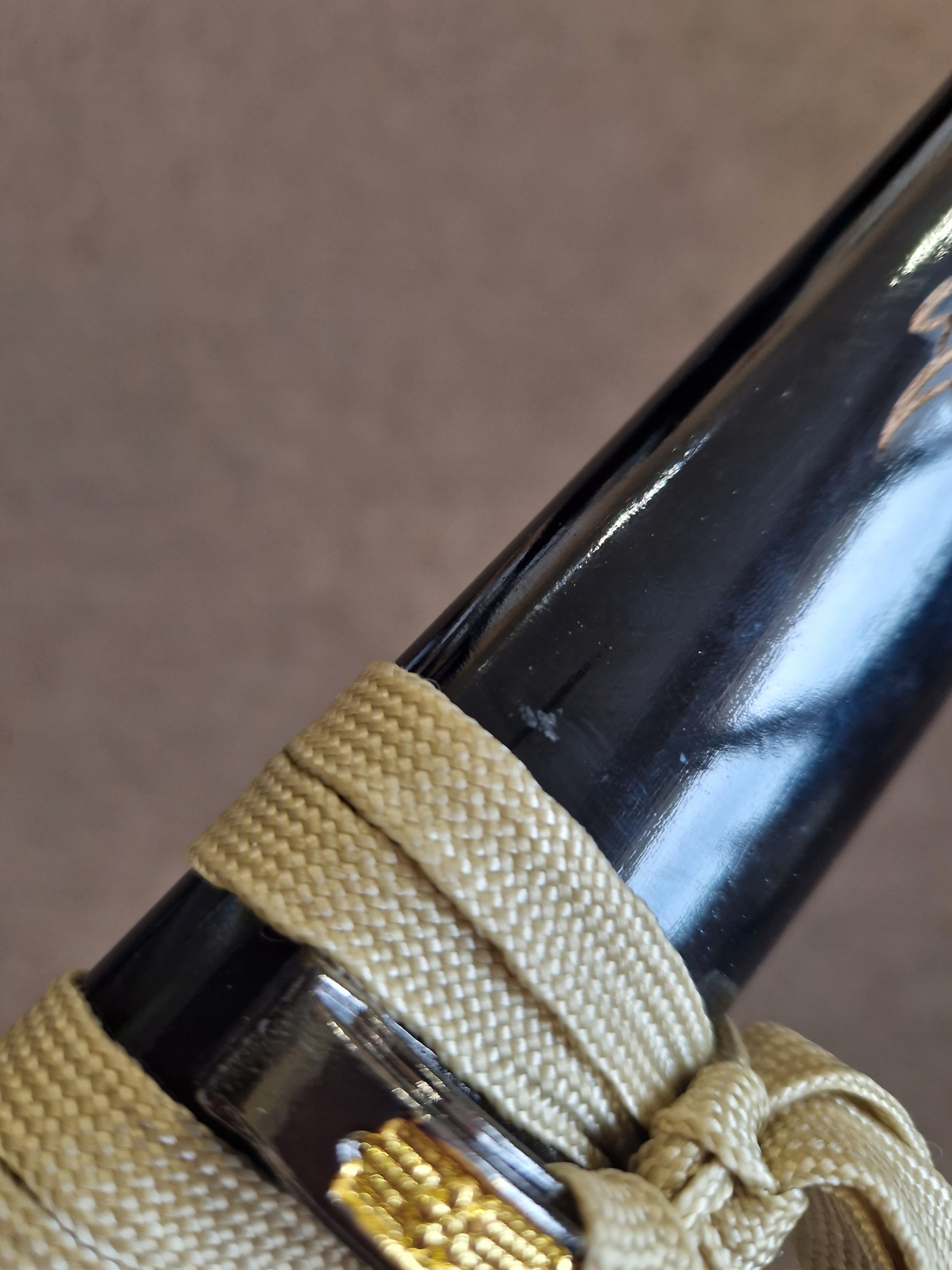 - НОЖНИ/ САЯ: Тверда деревина, розписана вручну в чорний колір, ручна різьба, чорна бавовняна оплетка на ручці, імітація шкіри ската, метал цуба.
