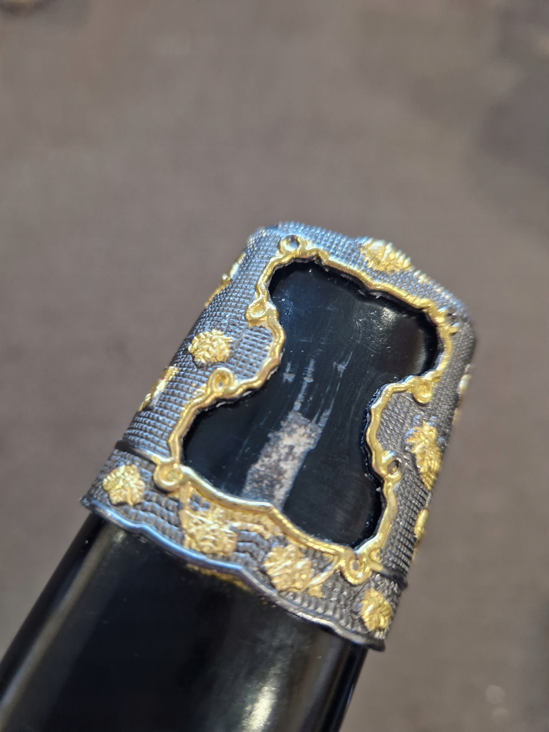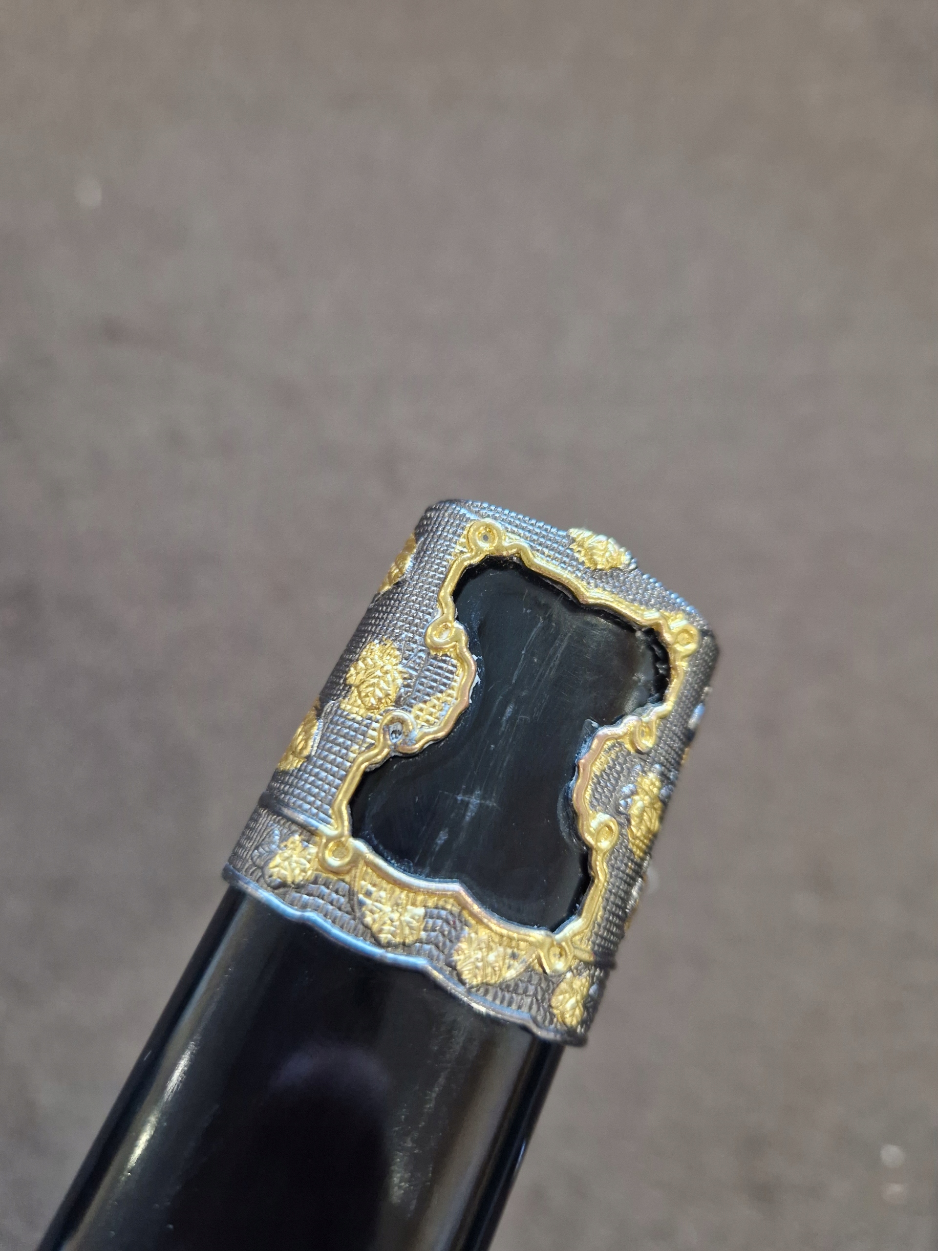 - НОЖНИ/ САЯ: Тверда деревина, розписана вручну в чорний колір, ручна різьба, чорна бавовняна оплетка на ручці, імітація шкіри ската, метал цуба.