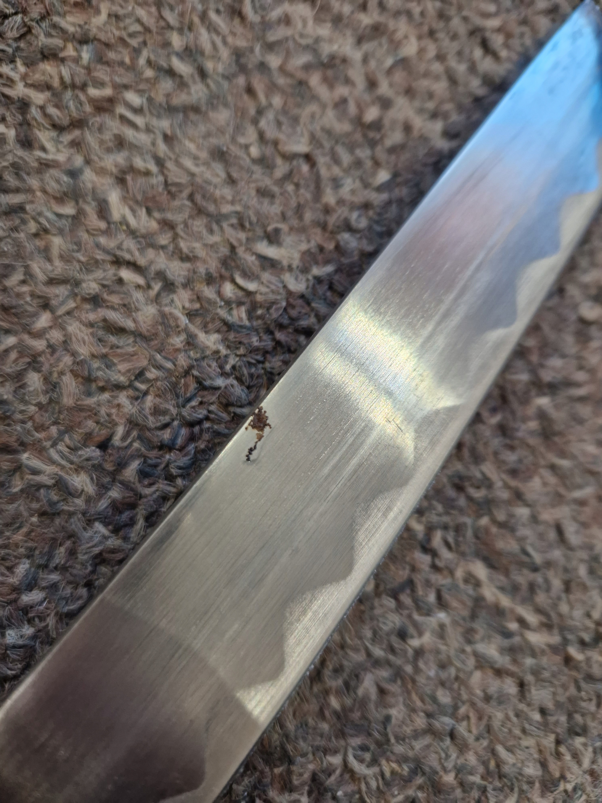 - ЛЕЗОК: вуглецева сталь, полірована (потребує догляду), прикрашений наконечник на лезі, хімічно отриманий хамон, гравіювання на рукоятці.