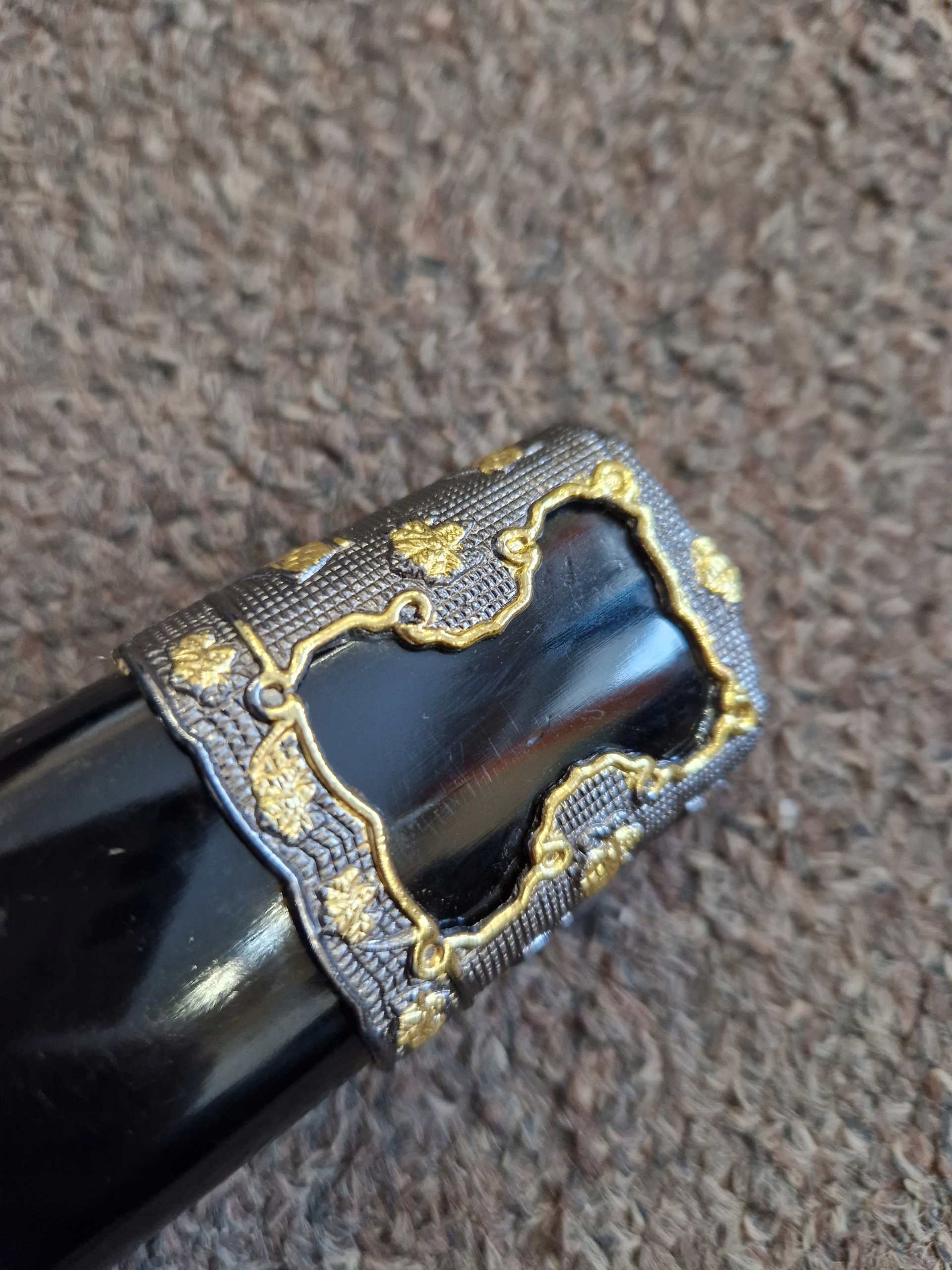 - НОЖНИ/ САЯ: Тверда деревина, розписана вручну в чорний колір, ручна різьба, чорна бавовняна оплетка на ручці, імітація шкіри ската, метал цуба.