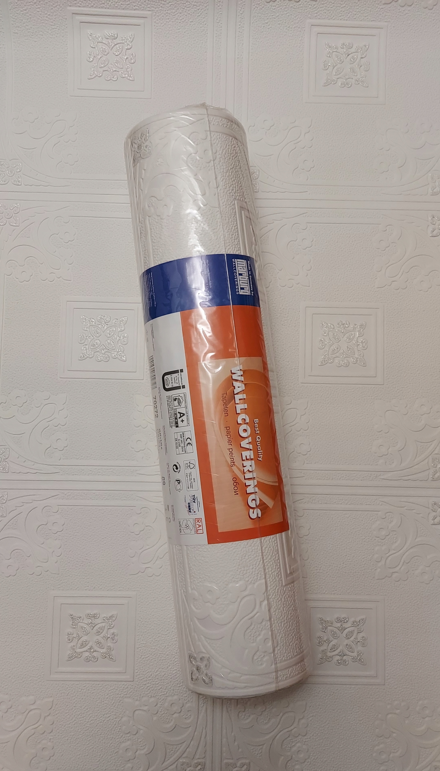 Шпалери на стелю, але ви також можете поклеїти їх на стіну. Це створює неймовірне відчуття розкоші та зберігає прекрасну простоту дизайну. Вінтажний, сільський стиль є чудовим, універсальним доповненням до будь-якої кімнати. Білі шпалери з місцями сріблястими блискітками створять приємну атмосферу. Підходить для вітальні, спальні, холу, коридору або офісу.