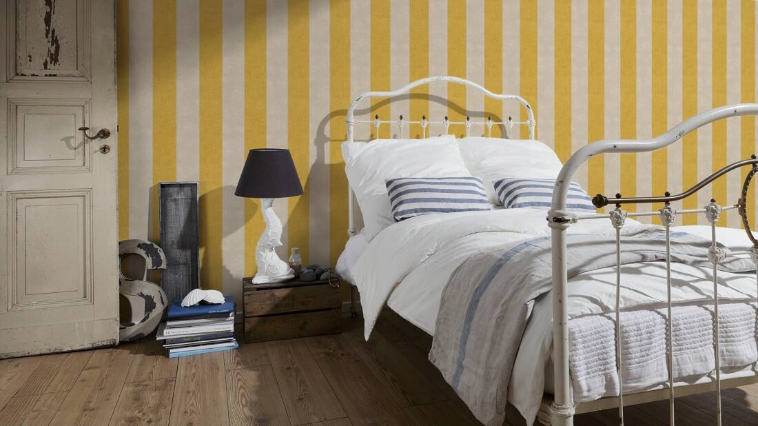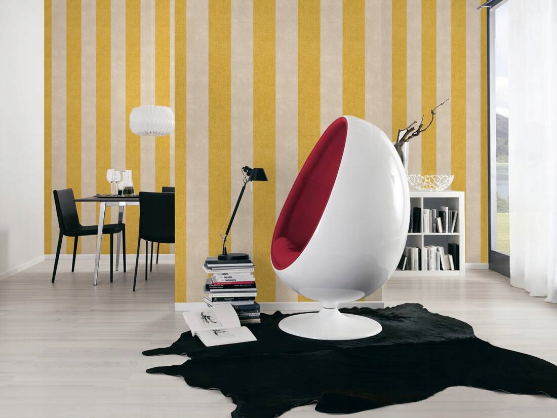 TAPETA ŻÓŁTE SZEROKIE PASY TAPETY IMITACJA TKANINY SALON SYPIALNIA